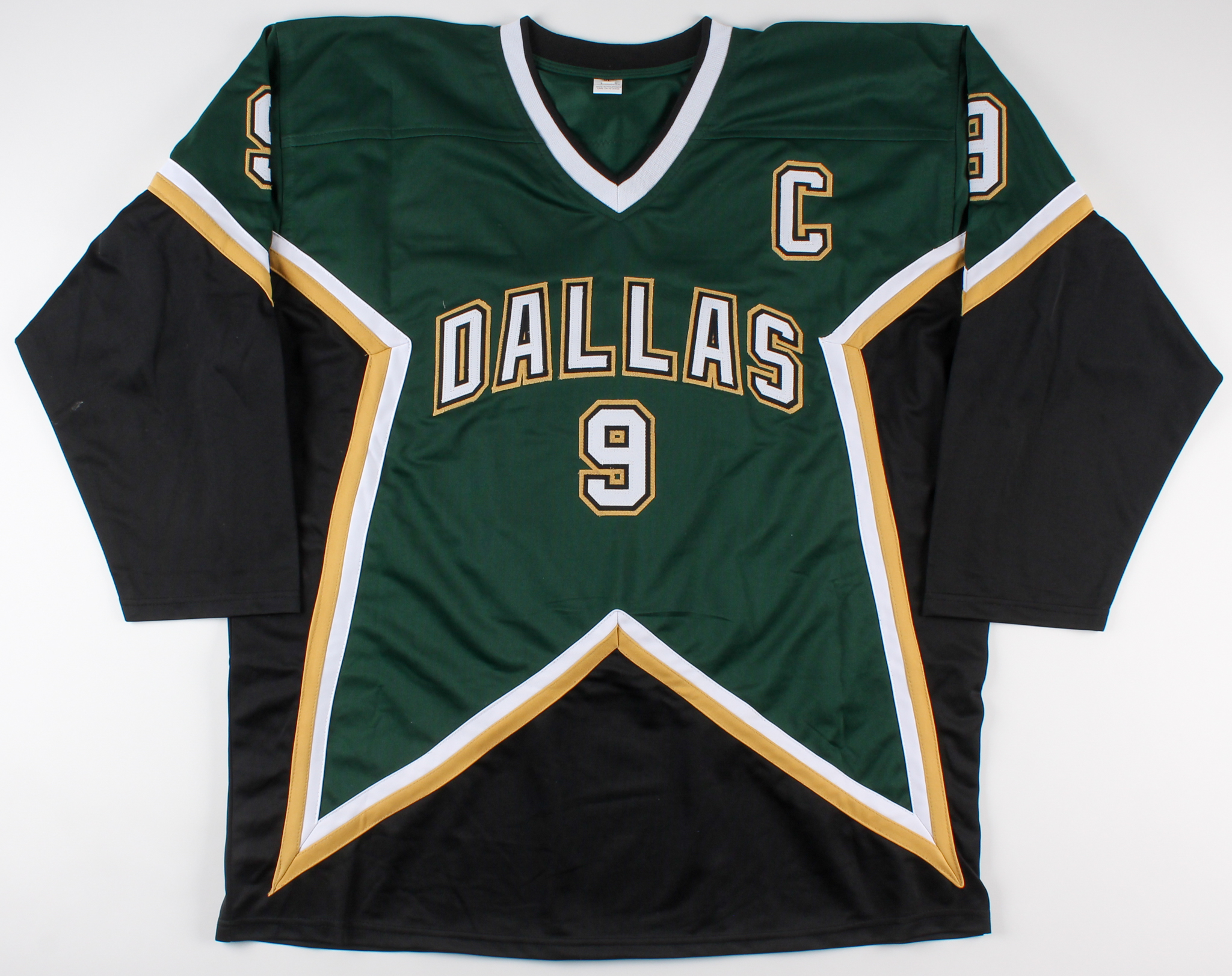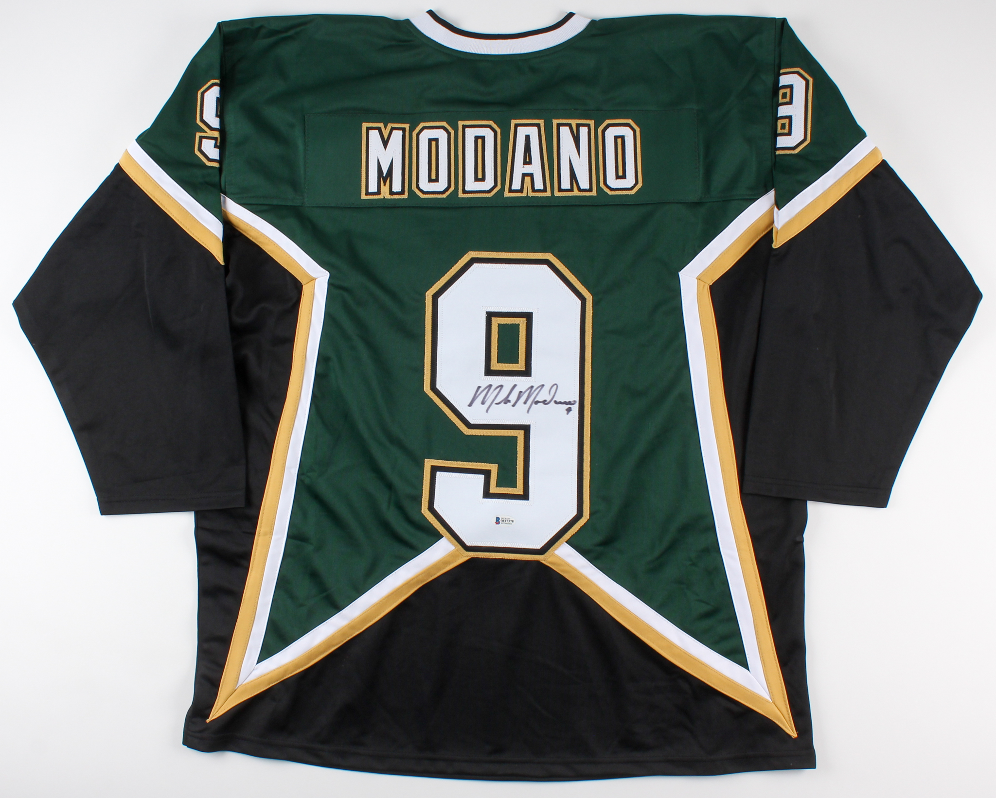 Custom on-ice style jersey. Everything is sewn on, size XL. Hand-signed in black flet-tip pen by Mike Modano (HOF).
