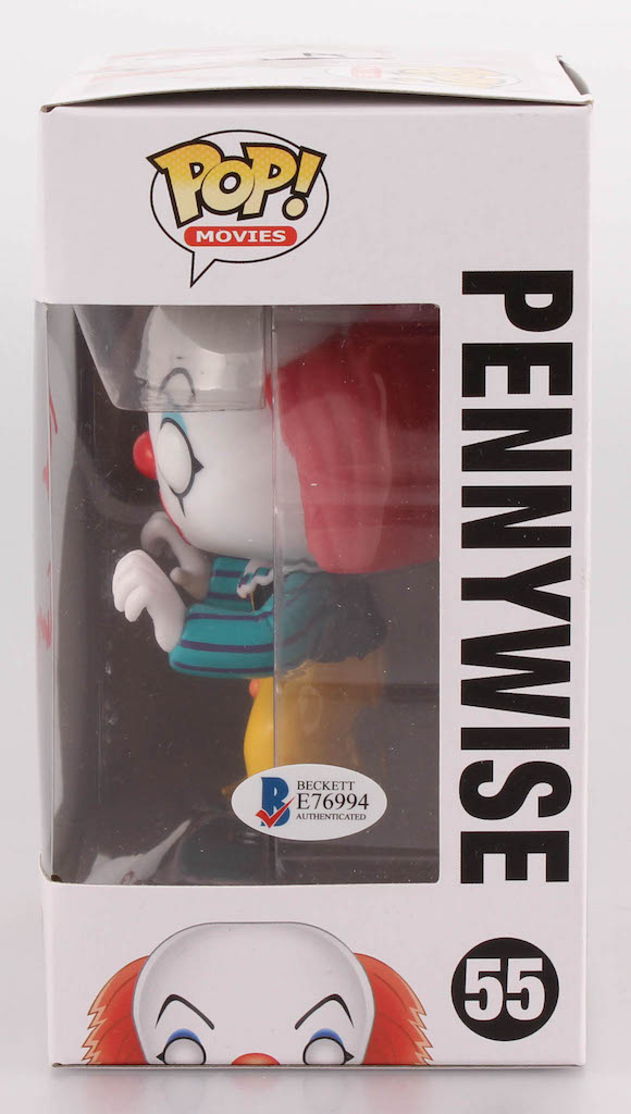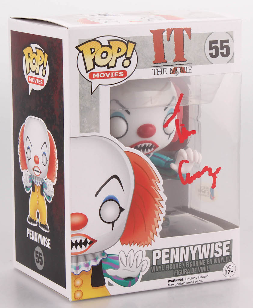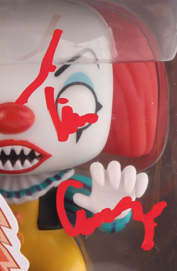 Funko Pop Movies #55 "IT The Movie" vinyl figure measures approximately 4" tall and has been hand-signed in red paint pen by Tim Curry.