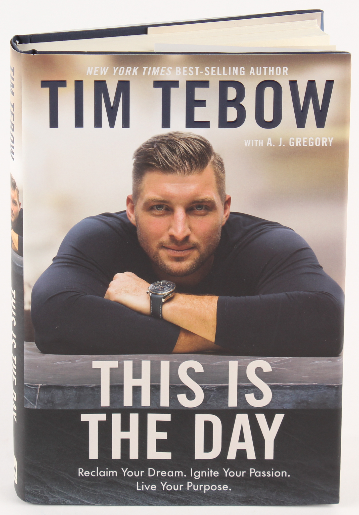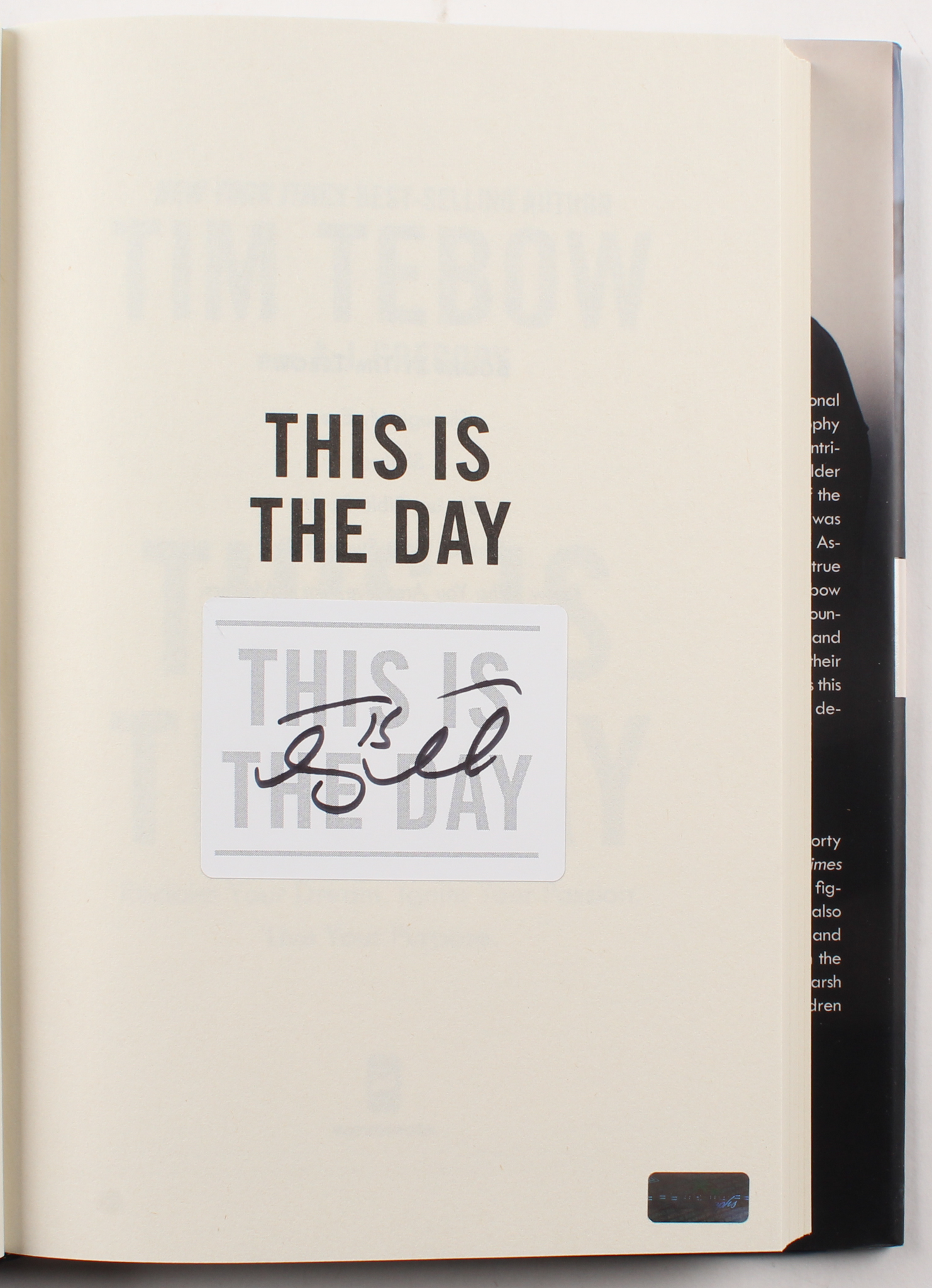 "This is the Day" Hard Cover Book. Hand-signed on inside cover page in black felt-tip pen by Tim Tebow