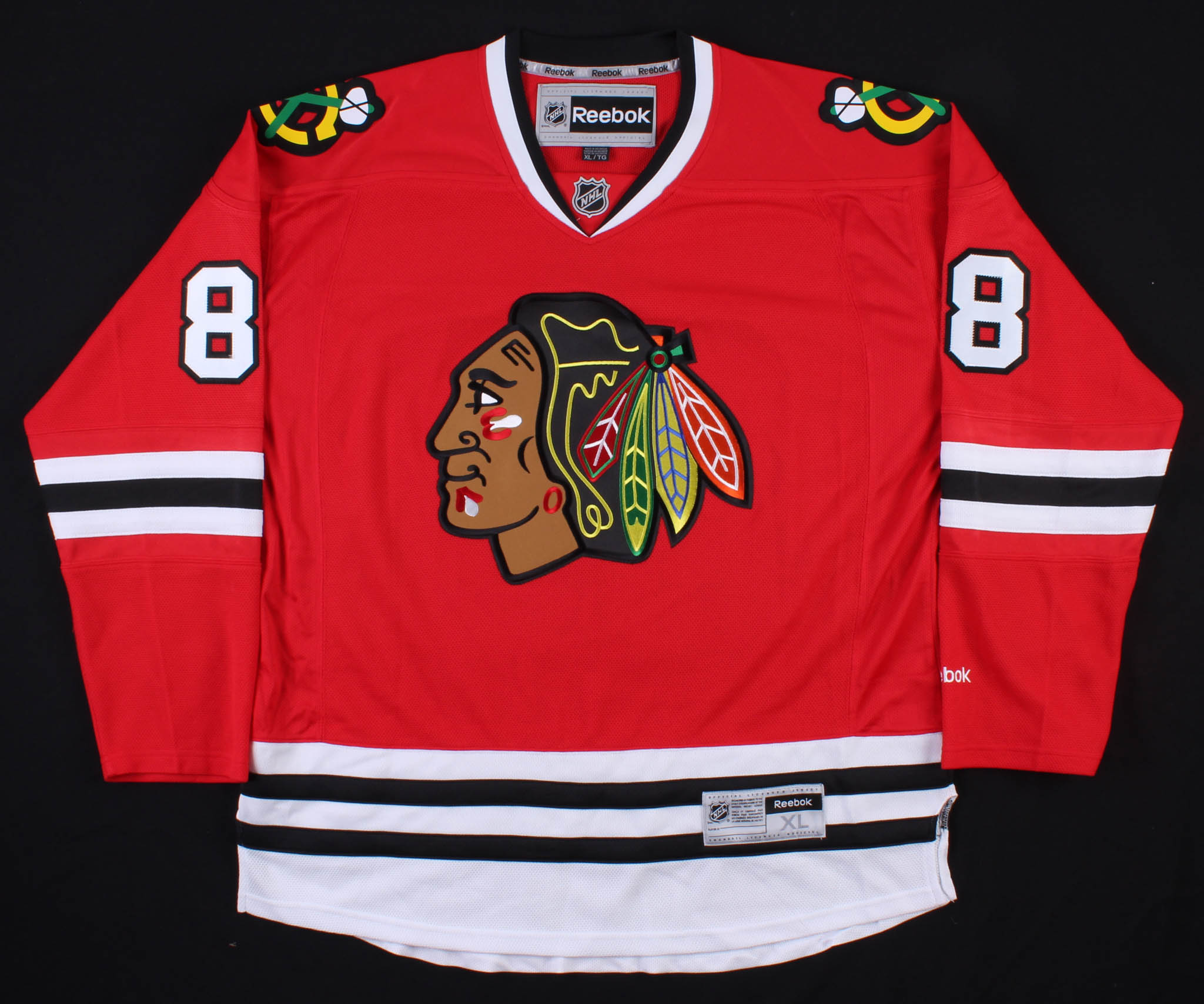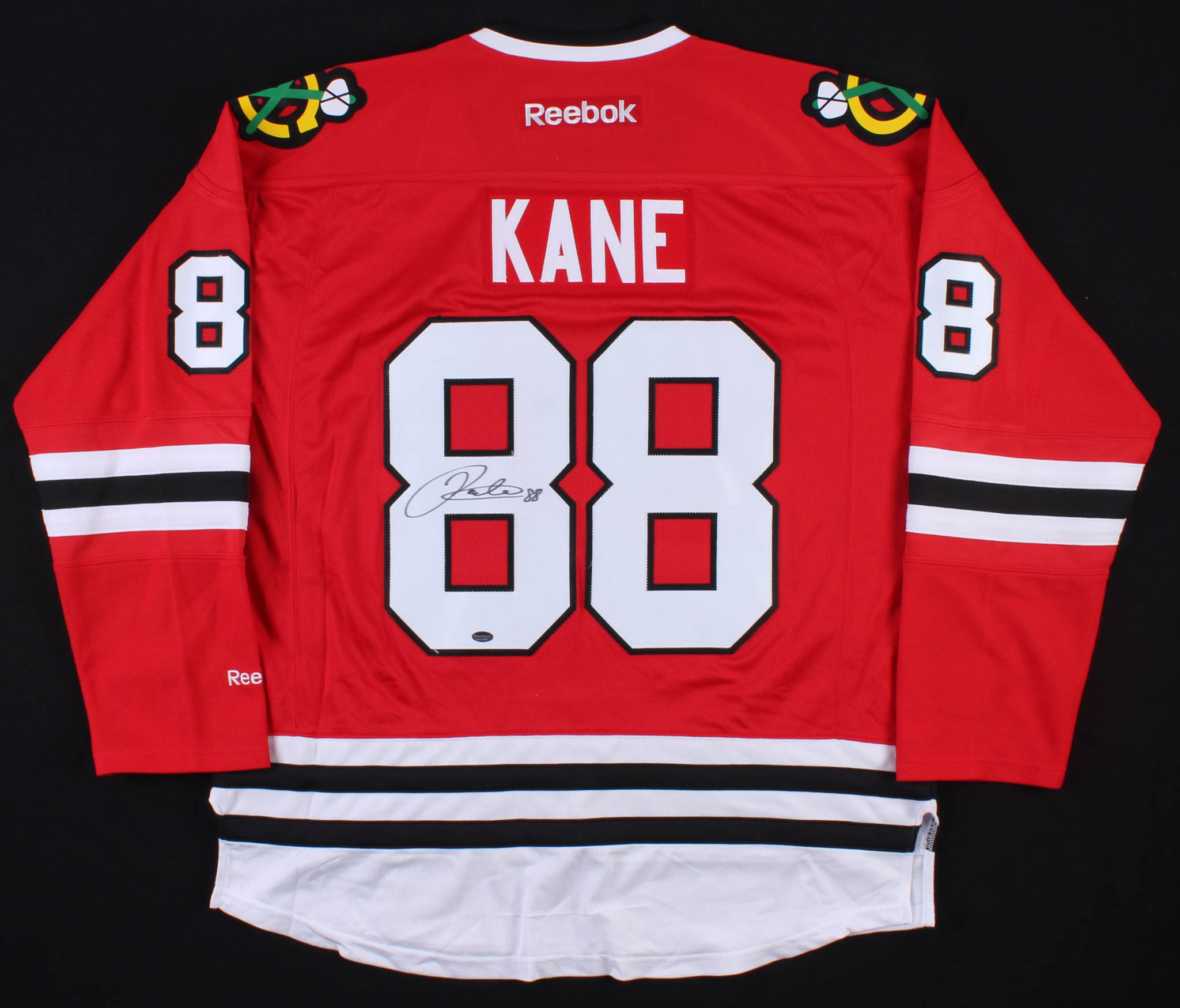 Reebok on-ice style jersey. Everything sewn on, size XL. Hand-signed in black felt-tip pen by Patrick Kane.