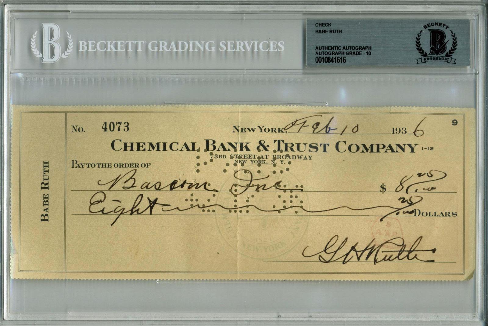 Attractive signed check with an extremely high-grade autograph from Babe Ruth. Check measuring 8.5" x 3.25", drawn on Ruth's personal bank account and made payable to Bascom Inc. for the sum of $8.00. The check is beautifully penned in Ruth's hand in black fountain pen ink and is signed, "G.H. Ruth". An excellent piece worthy of the grading from Beckett Authentication Services (BAS) impeccable GEM MINT 10 grading. Authenticated, encapsulated & graded by Beckett Authentication Services.