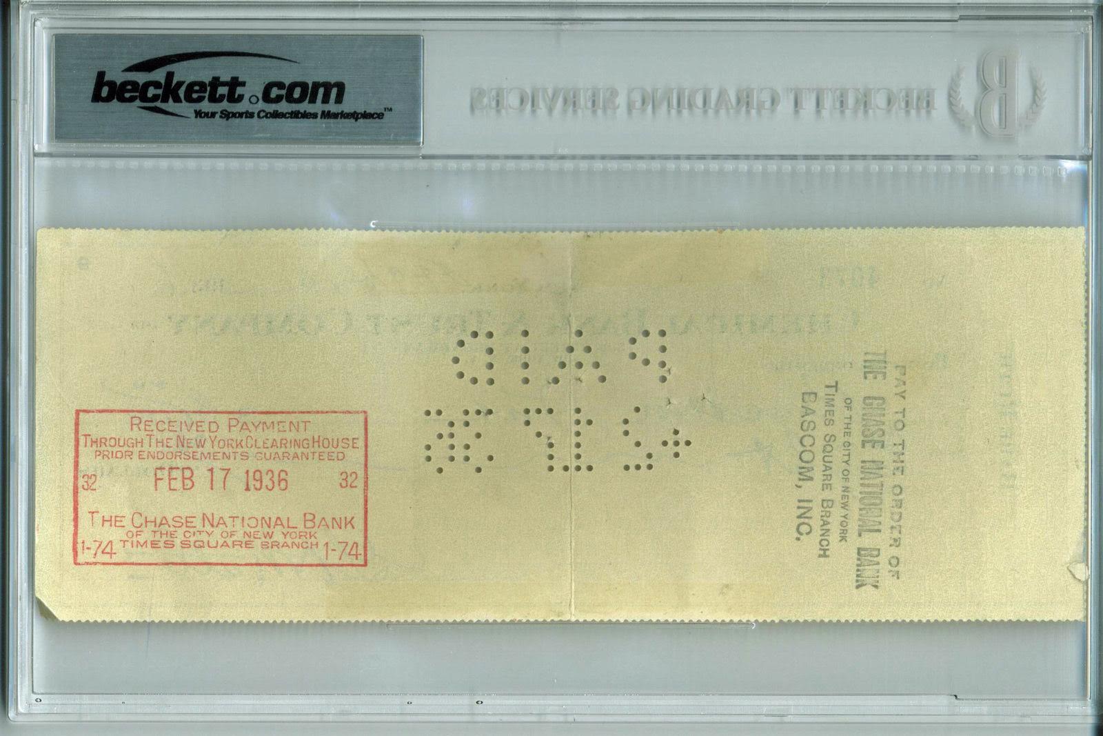 Babe Ruth Signed 1936 Personal Bank Check (BGS Encapsulated)