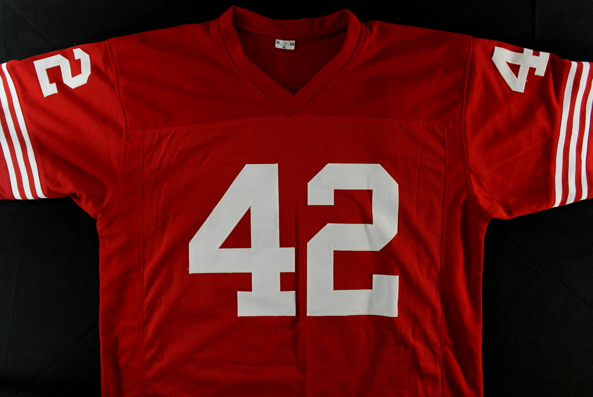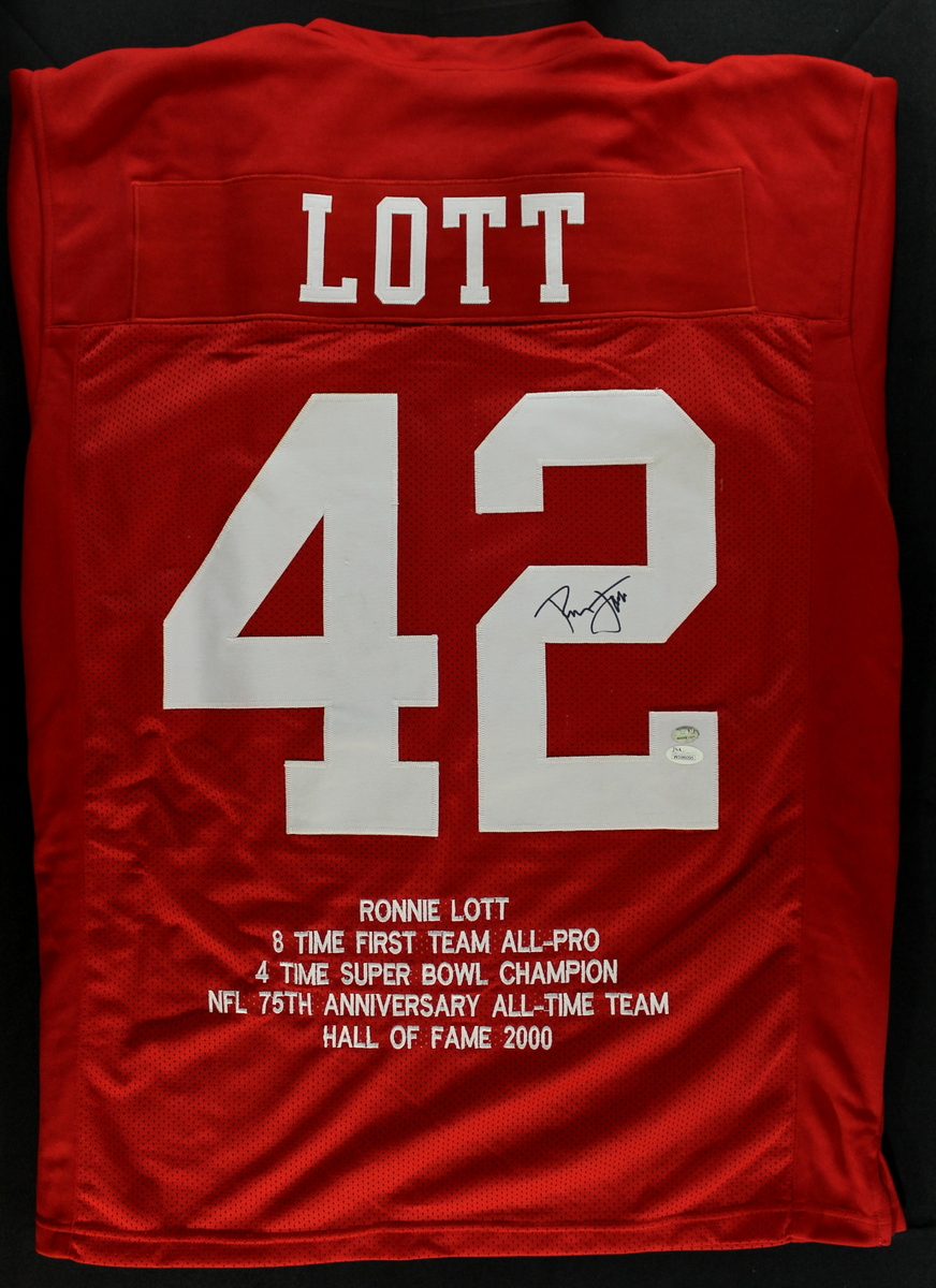 Custom on-field style jersey. Everything sewn on, size XL. Hand-signed in black felt-tip pen by Ronnie Lott (49ers, HOF). Lott's career stats are stitched on the back below the numbers. The autograph includes an official James Spence Authentication (JSA) hologram and matching COA & official GT Sports Marketing player hologram for authenticity purposes. The signing of this item was witnessed by JSA.