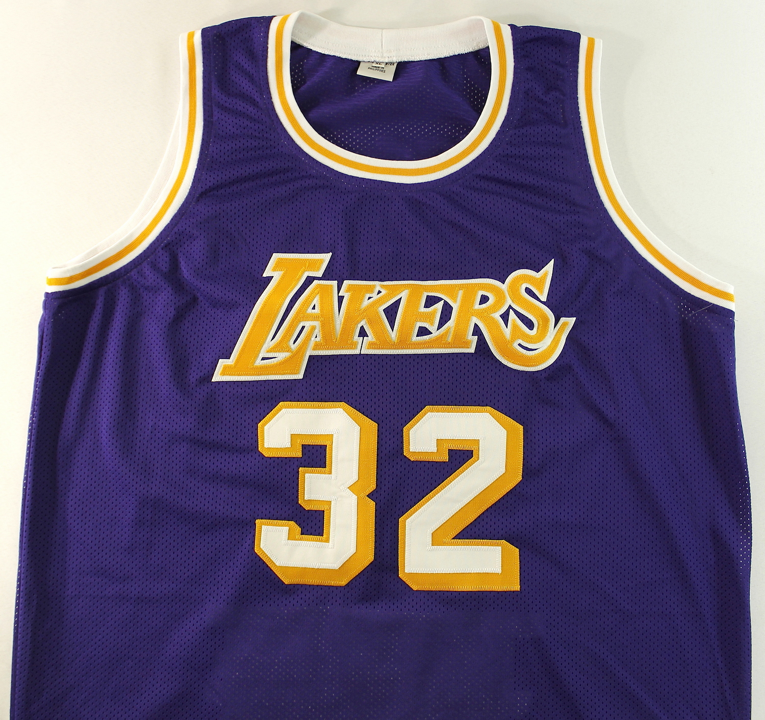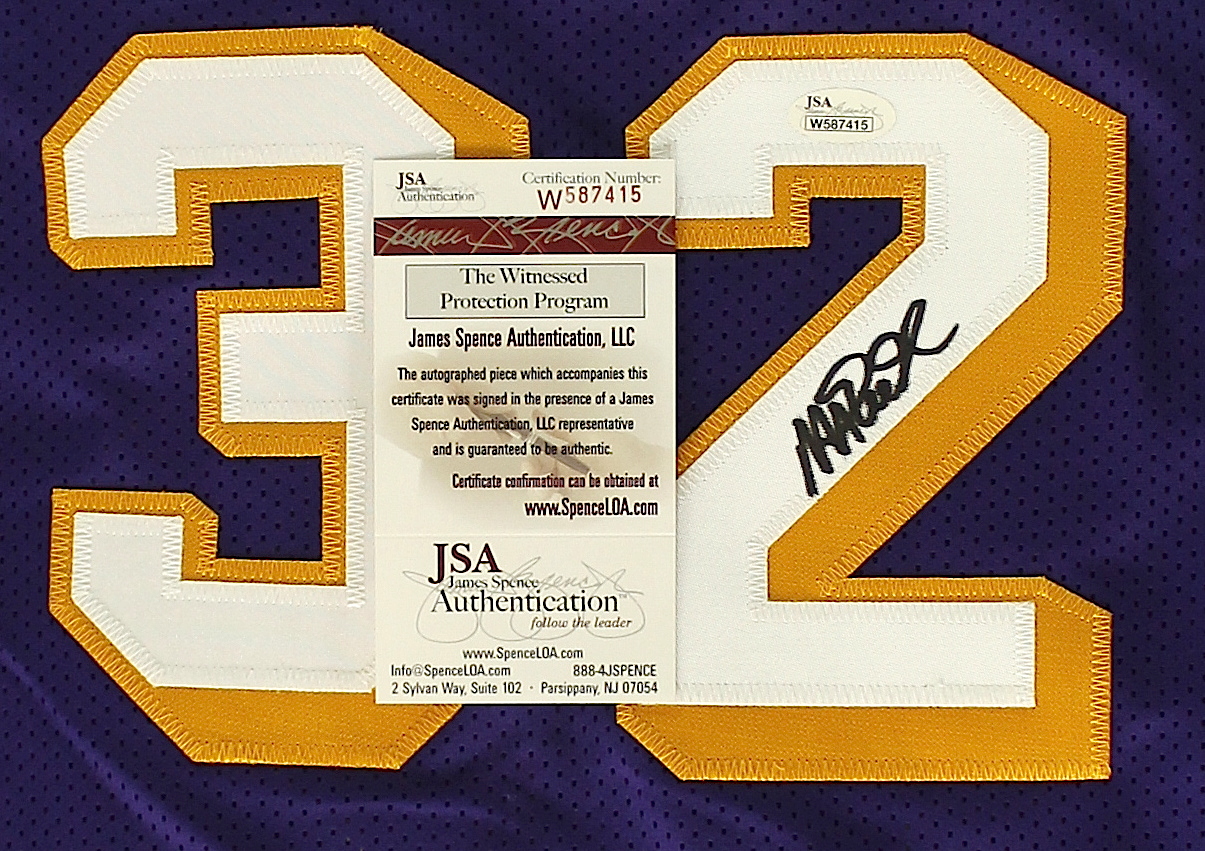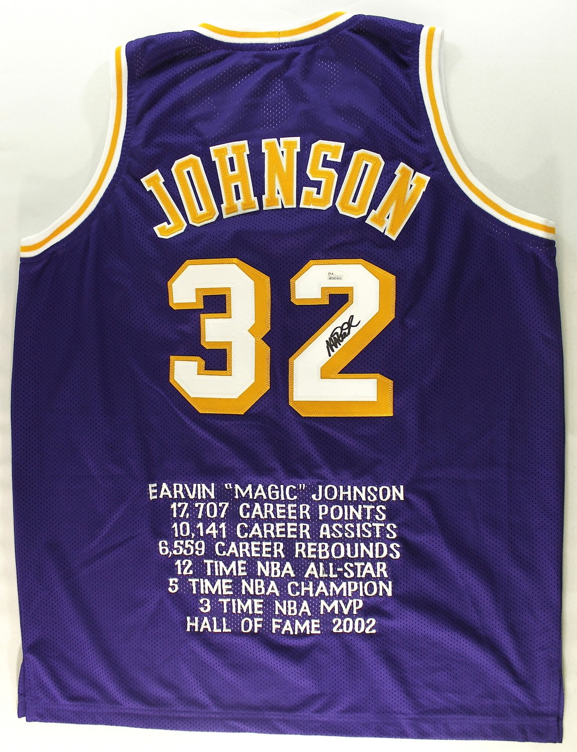 Custom on-court style jersey. Everything is sewn on, size XL. Hand-signed in black felt-tip pen by Magic Johnson (Lakers HOF). Magic Johnson's career highlights have been custom stitched on to the back of the jersey. The autograph includes an official James Spence Authentication (JSA) hologram and matching COA for authenticity purposes. The signing of this item was witnessed by JSA.