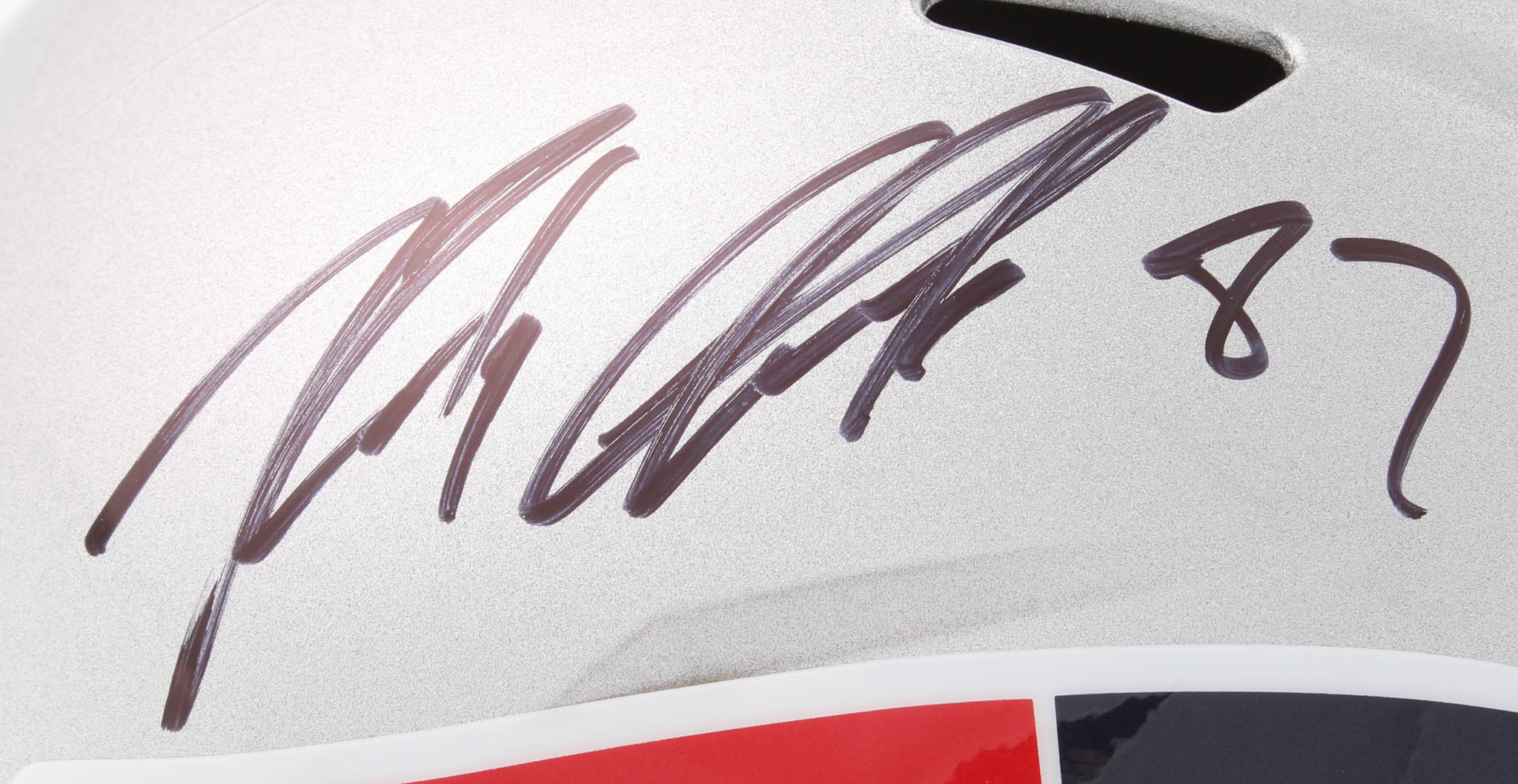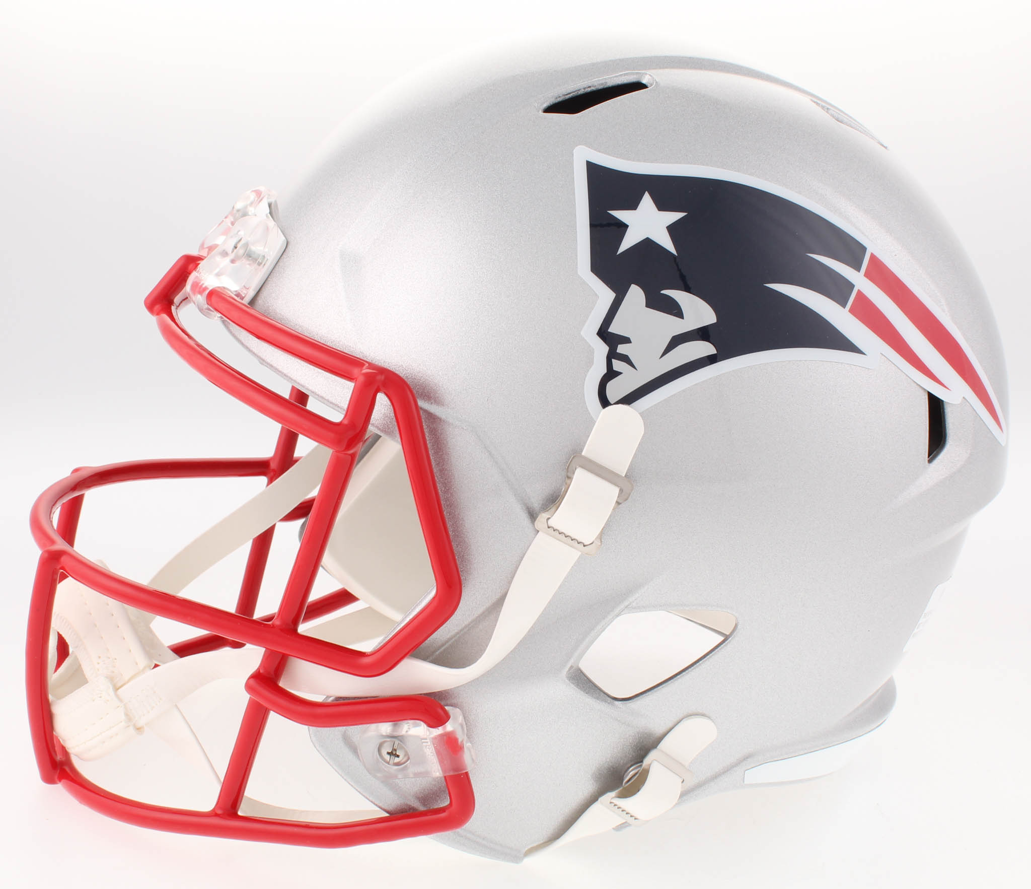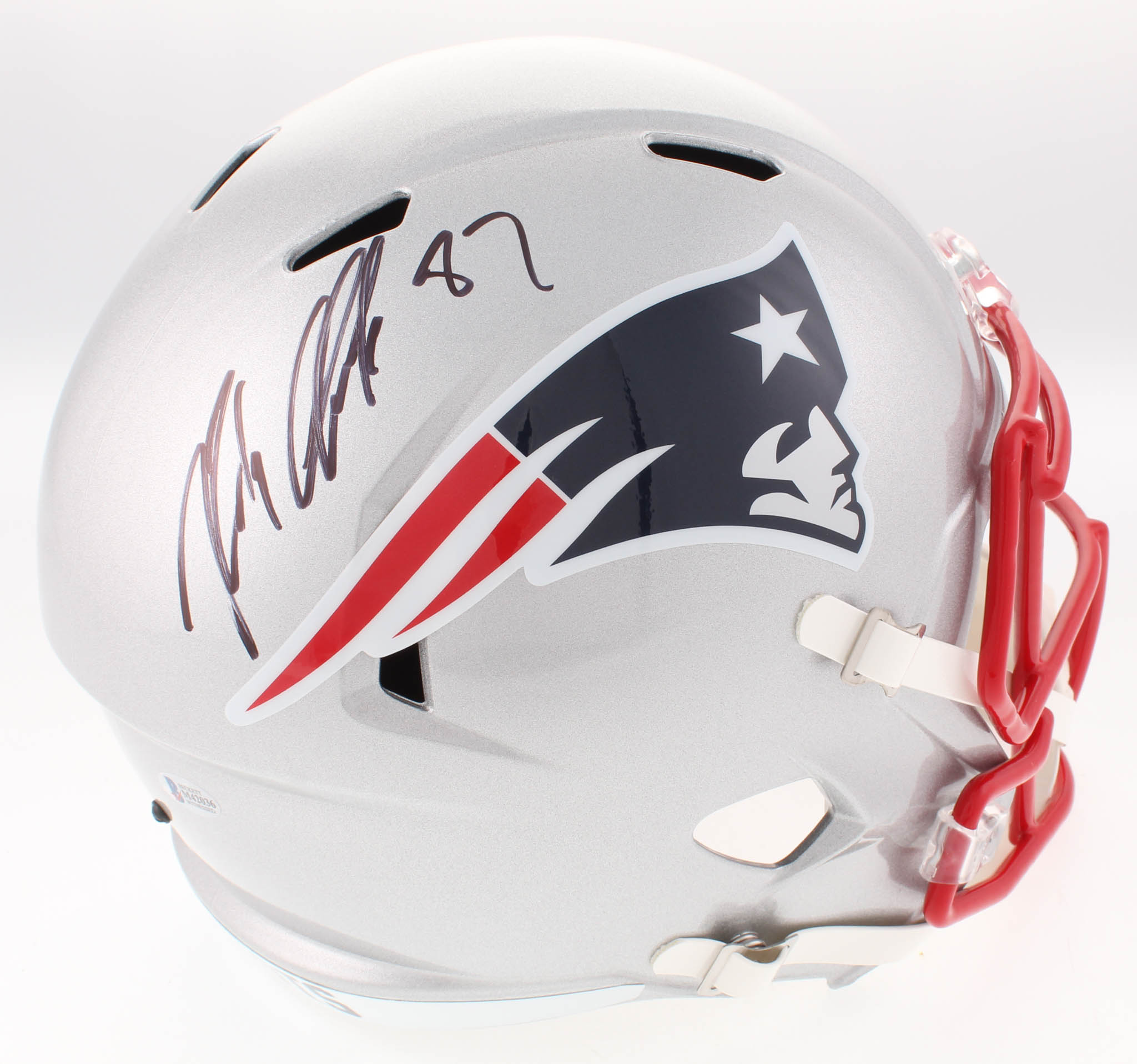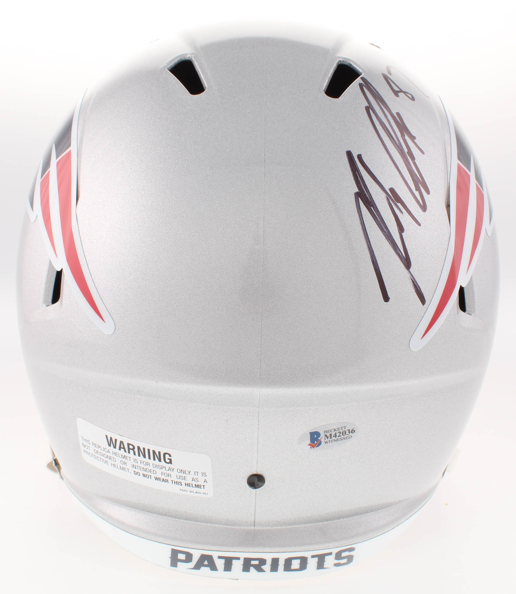 Riddell New England Patriots full-size replica speed helmet. Hand-signed in black felt-tip pen by Rob Gronkowski.