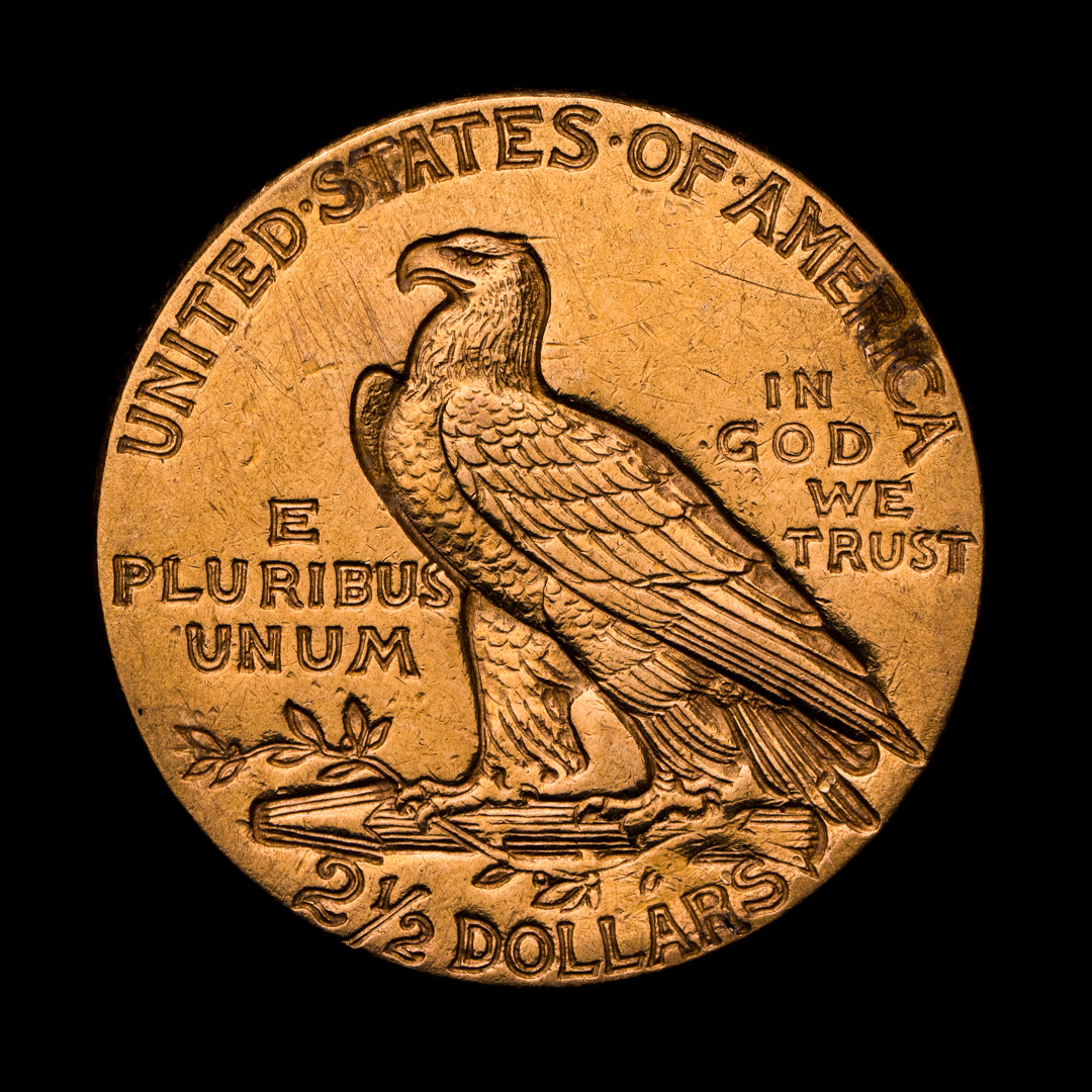 Designed by Bela Lyon Pratt, a student of Augustus Saint-Gaudens, the $2.50 Indian features legends and motifs that are incused rather than raised on the coin, making them one of only two U.S. coins minted in this manner. The obverse features a stoic Indian chief profile, surrounded by 13 small stars and the word "Liberty" along with the date. The reverse shows a regal bald eagle with a cluster of arrows and an olive branch, symbolic of war and peace, beneath the eagle’s talons.