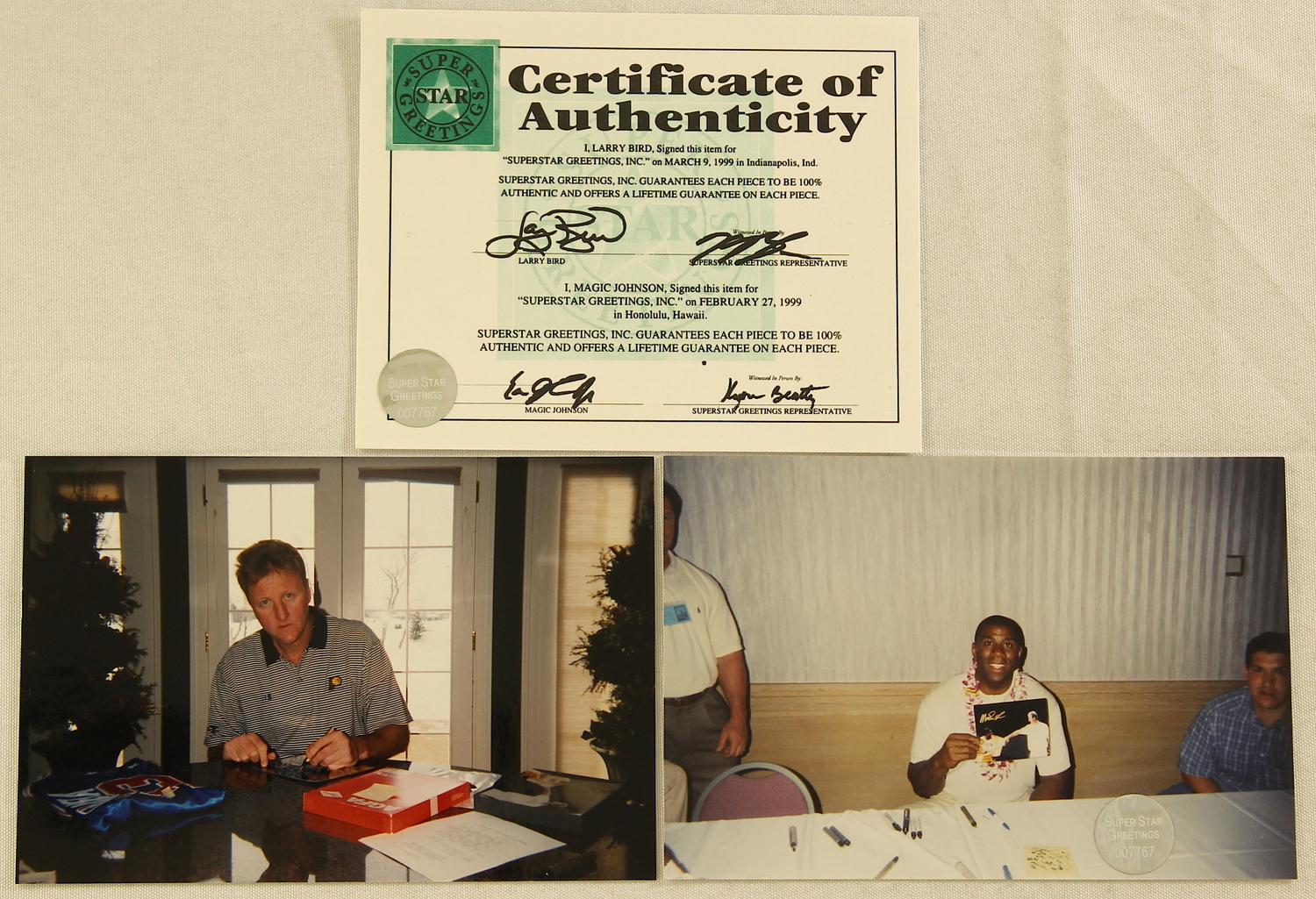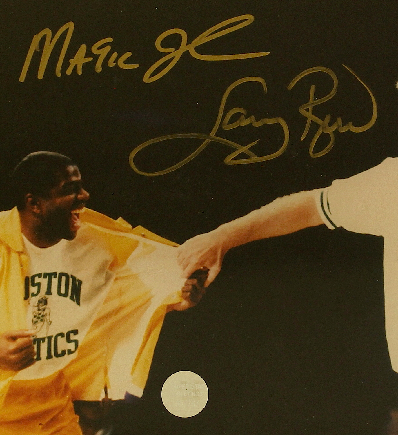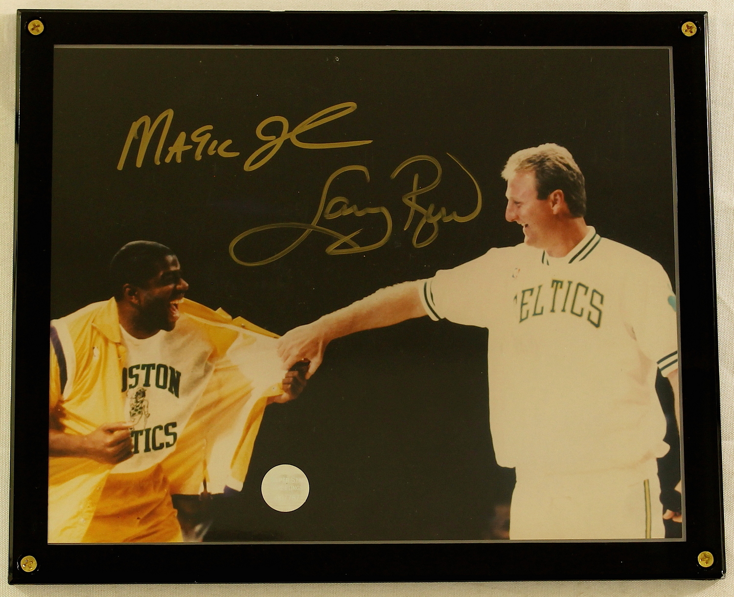 8" x 10" photo in plastic frame (framed to an overall size of 9.5" x 11"). Hand signed in gold paint pen by both Magic Johnson (Lakers HOF) & Larry Bird (Celtics HOF). The autograph includes an official Super Star Greetings hologram and matching COA for authenticity purposes.