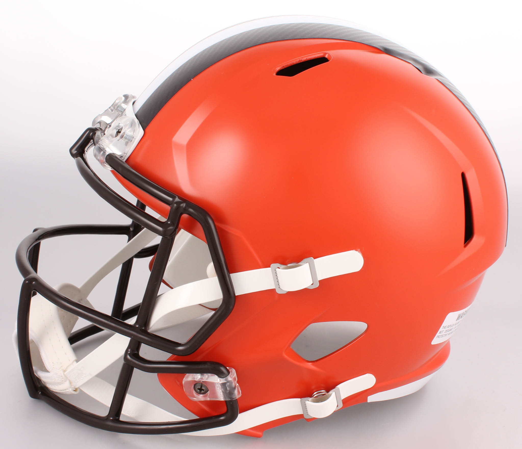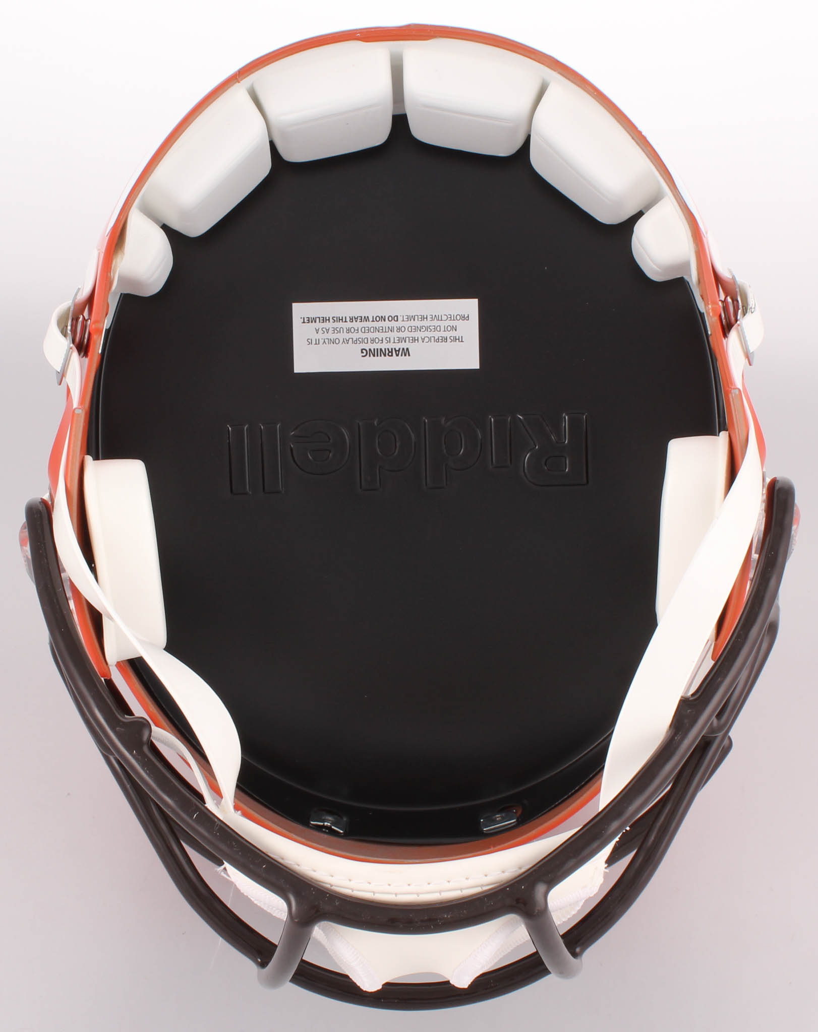 Riddell Cleveland Browns full-size replica speed helmet. Hand-signed in black felt-tip pen by Nick Chubb.
