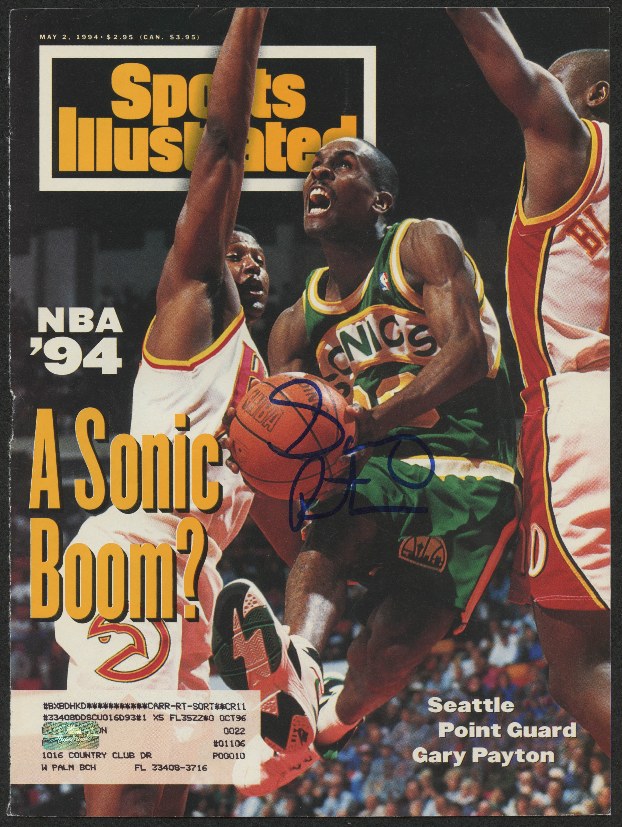 May 2, 1994 Sports Illustrated cover page measures 8" x 10" in size and has been hand-signed in blue felt-tip pen by Gary Payton (HOF).