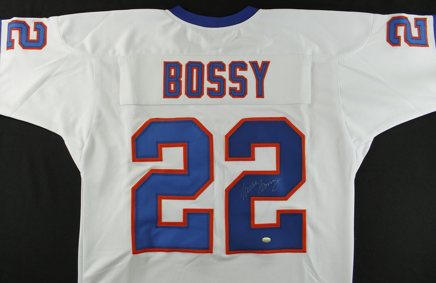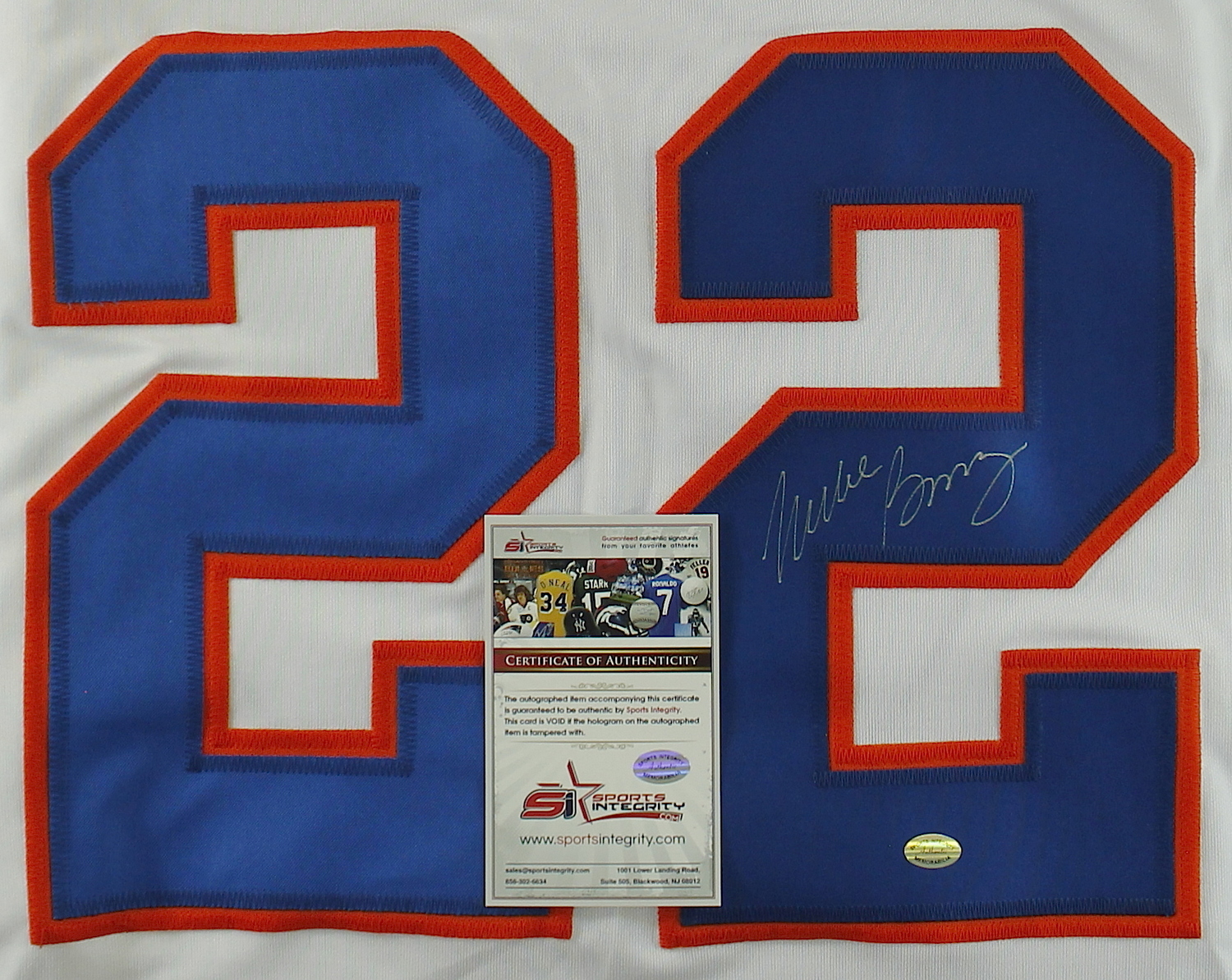 Custom on-ice style jersey. Everything sewn on, size L. Hand-singed and inscribed in silver paint pen by Mike Bossy. The autograph includes an official Sports Integrity hologram and COA for authenticity purposes.