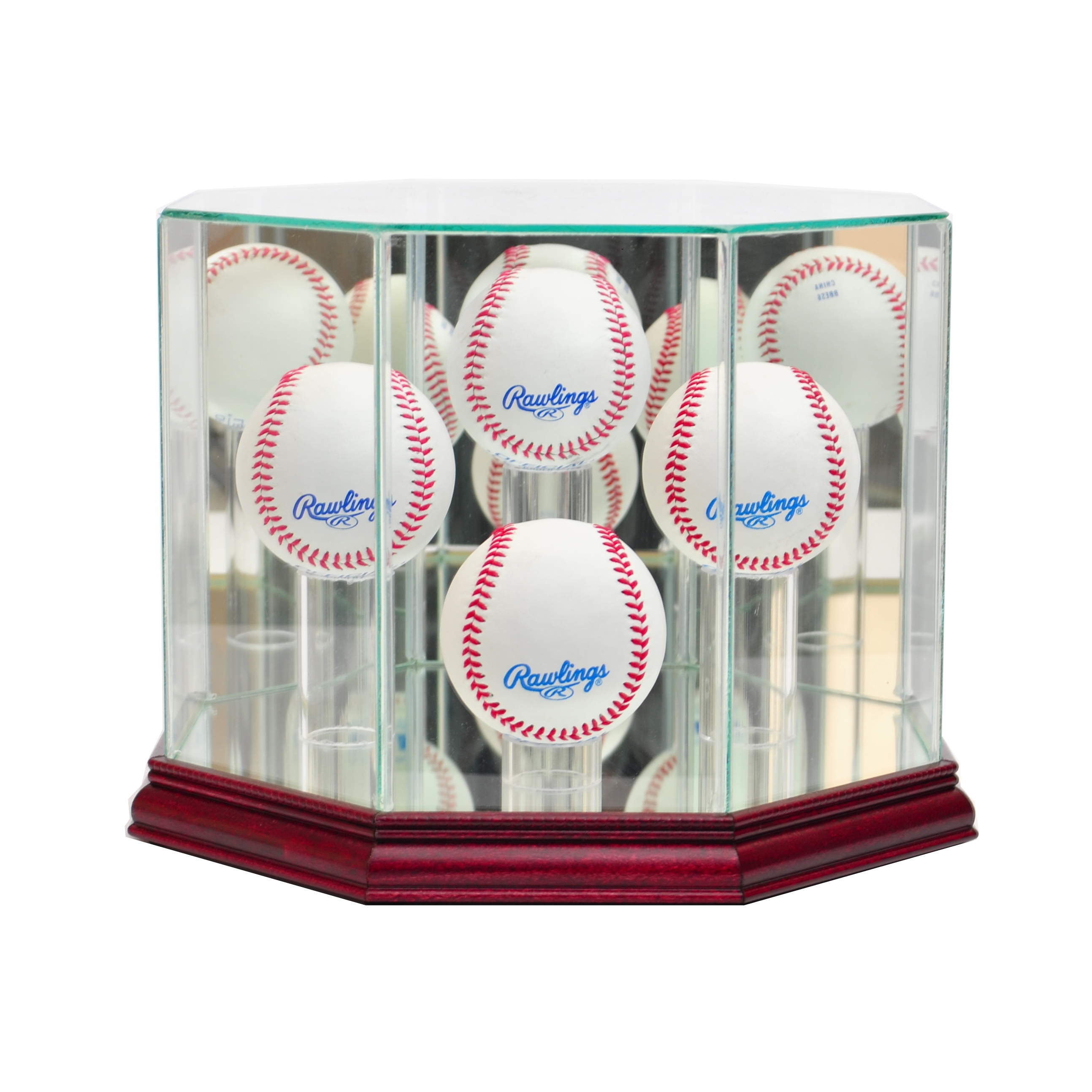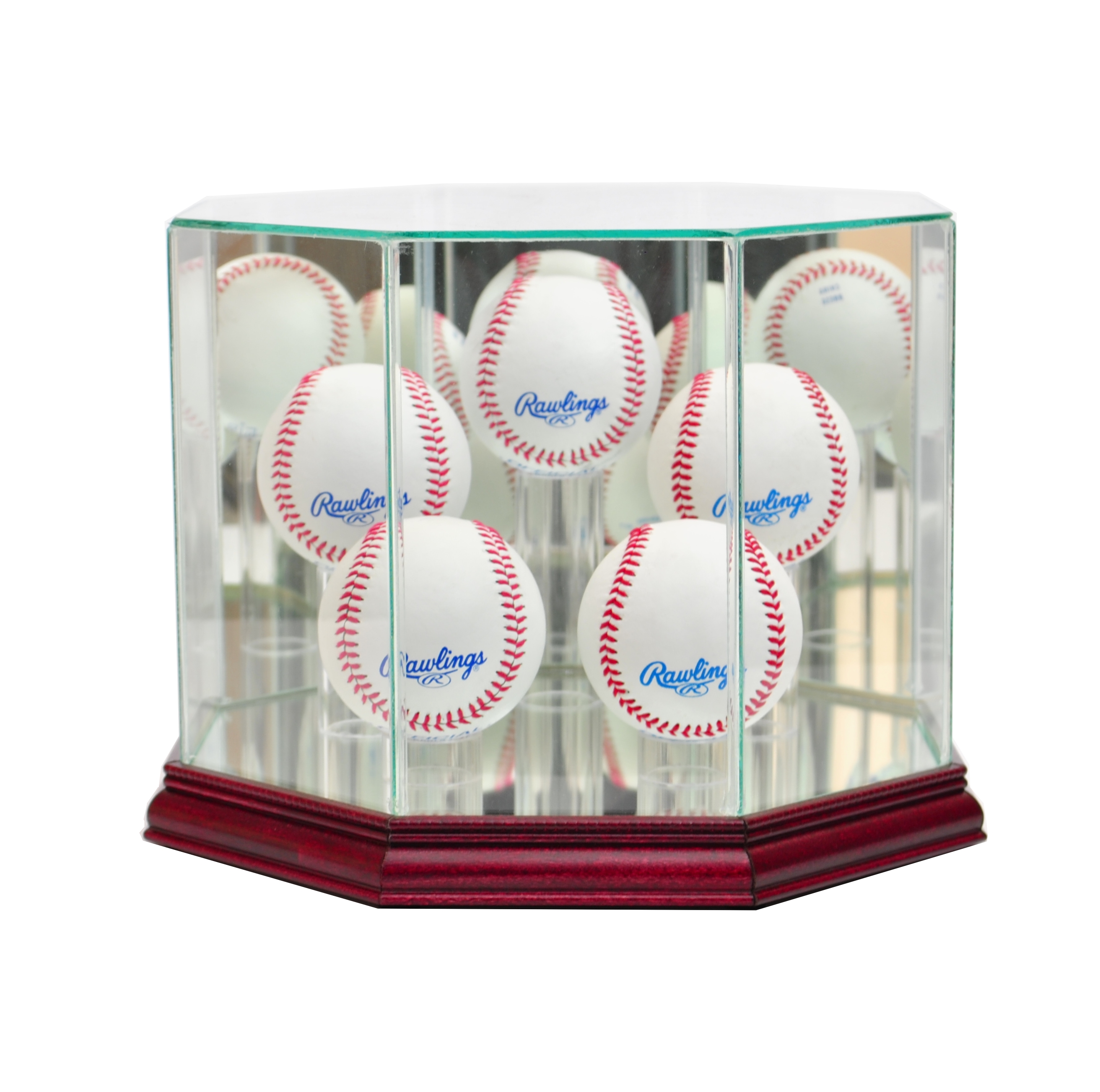 4-6 Baseball Octagon Premium Glass Display Case with Mirrored Cherry Wood Base & Mirrored Back