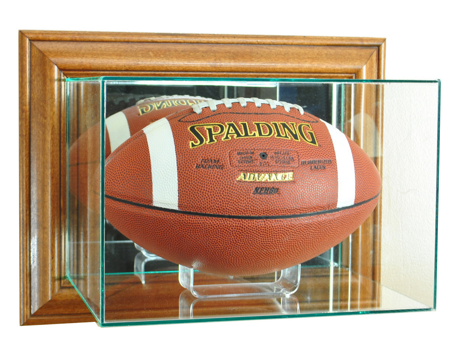 This uniquely designed wall mounted display case is the perfect way to protect and display your autographed football. This case is made so that the top hinges open for easy access inside. This display case is made with UV Protected, double strength glass and mirror and accented with real wood moulding. This display case is made with mirror on the back to enhance the look of what you want displayed. This display case also includes an acrylic stand for your football.