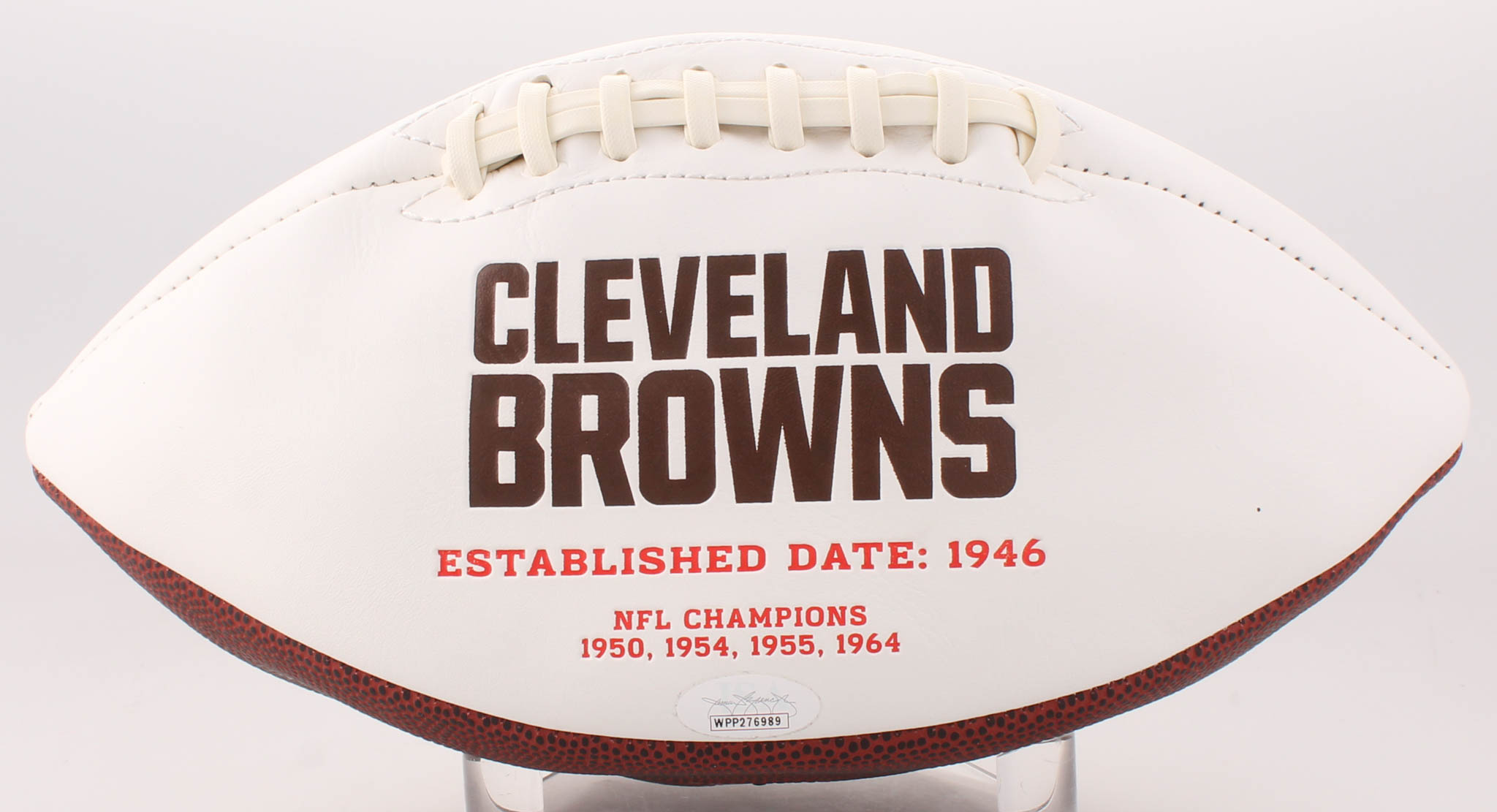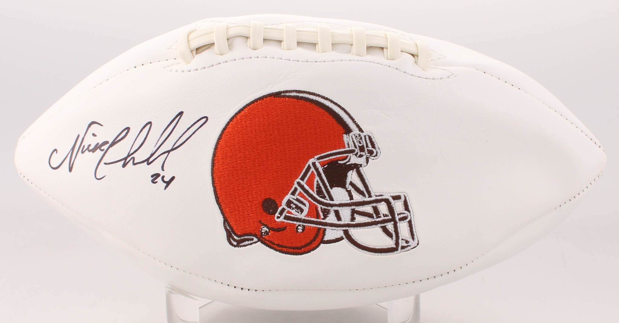 Cleveland Browns logo football has been hand-signed in black felt-tip pen by Nick Chubb. Please note, the football does not hold air.
