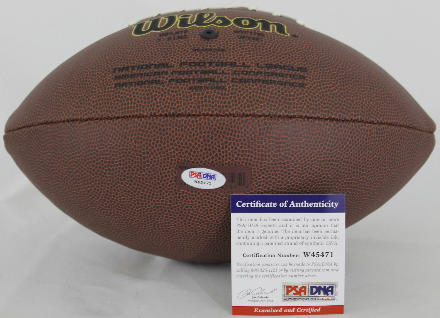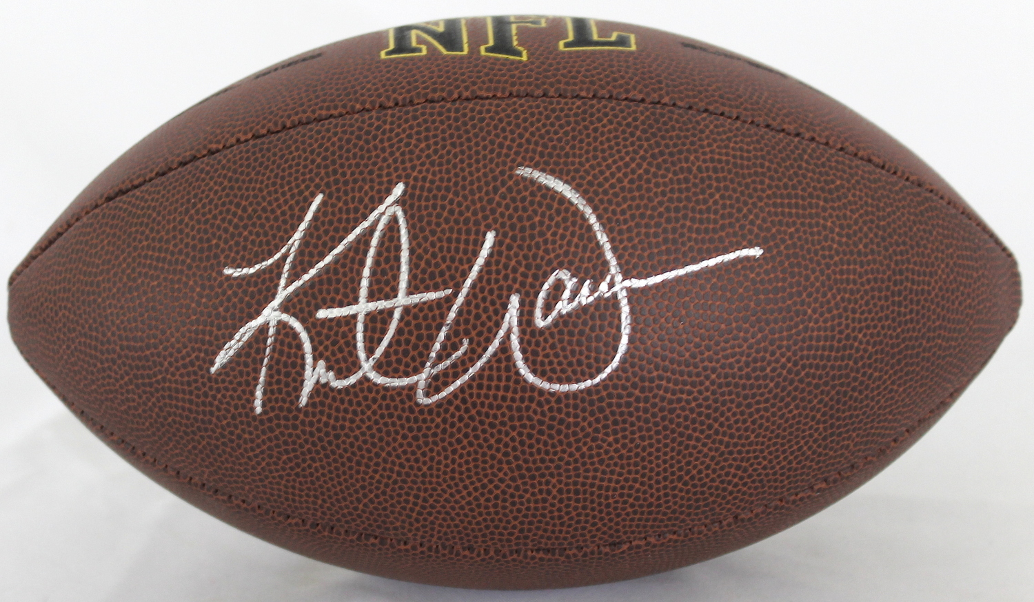 Full-Size Wilson NFL Football. Hand-signed in silver paint pen by Kurt Warner (Rams, Cardinals). The autograph includes an official PSA/DNA hologram and matching COA for authenticity purposes.