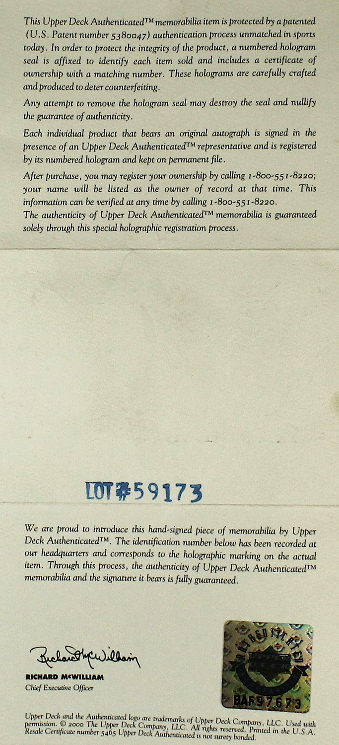 The autograph includes an official Upper Deck Authenticated hologram and matching COA for authenticity purposes.