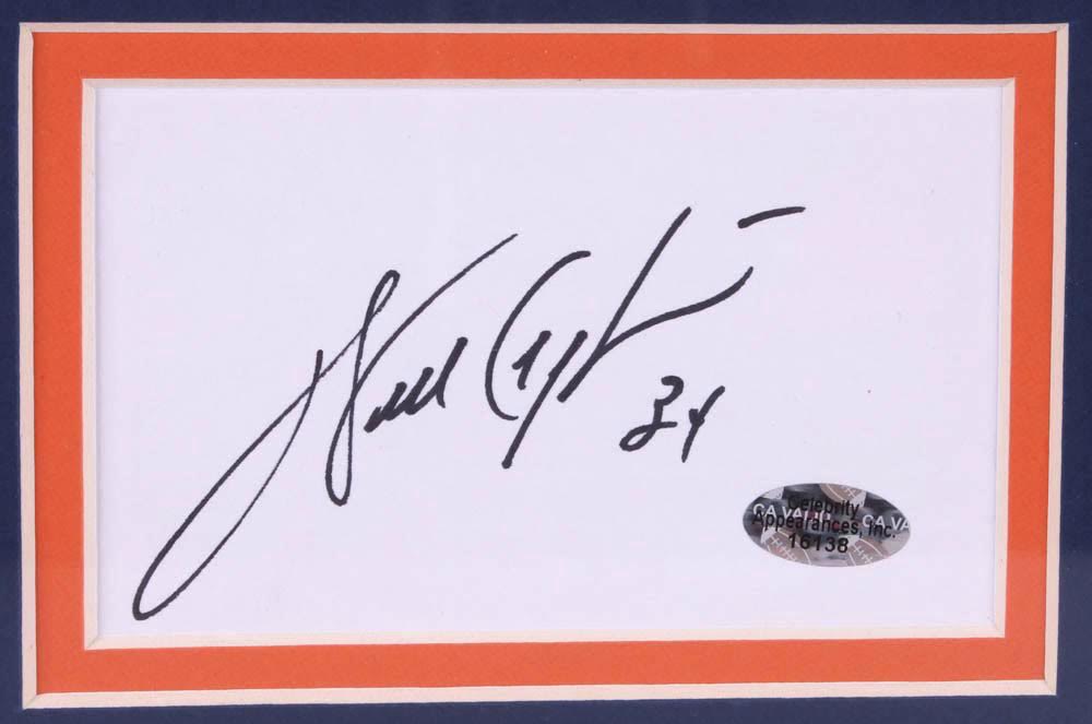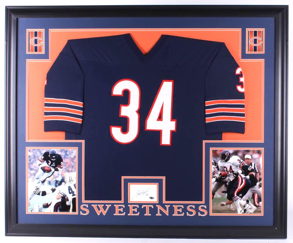 Custom frame measures approximately 35" x 43" in size and features a 3" x 5" cut which has been hand-signed in black felt-tip pen by Walter Payton (D. 1999, HOF). Also comes with the jersey as shown.