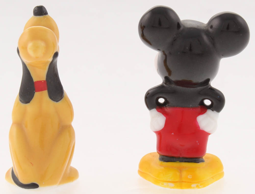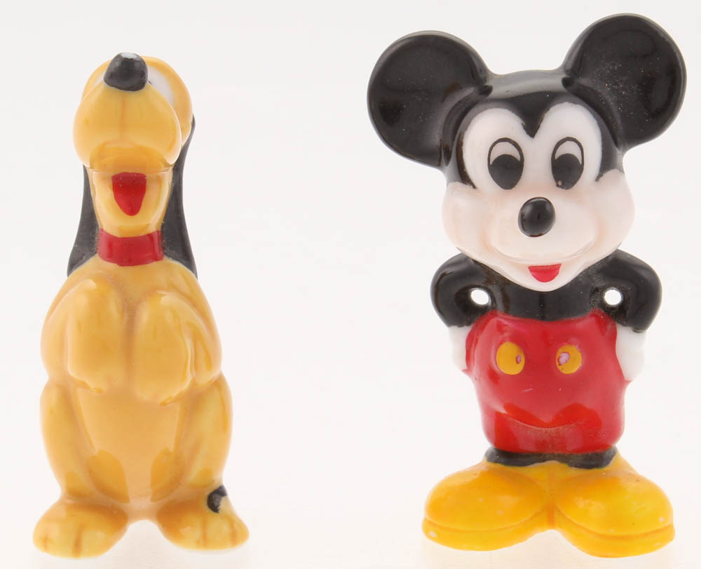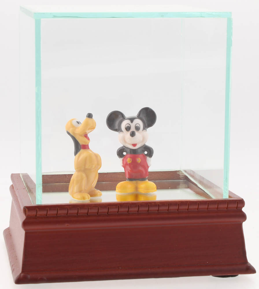 Vintage Disney Mickey Mouse and Pluto ceramic figurines measures approximately 2" in height. Includes high-quality display case with a wooden base and glass cube.
