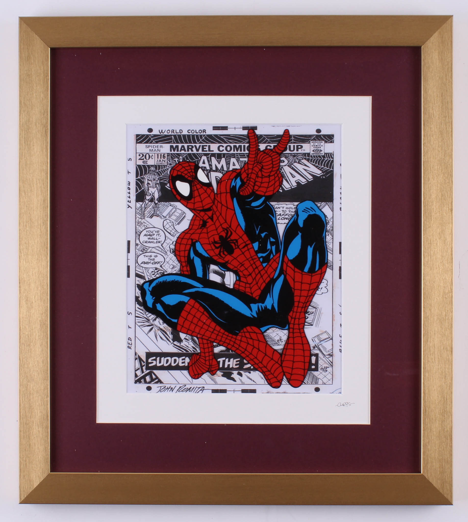 Custom framed cel measures 16" x 18" in size and features a Marvel animated cel from "Spider-Man" by John Romita.