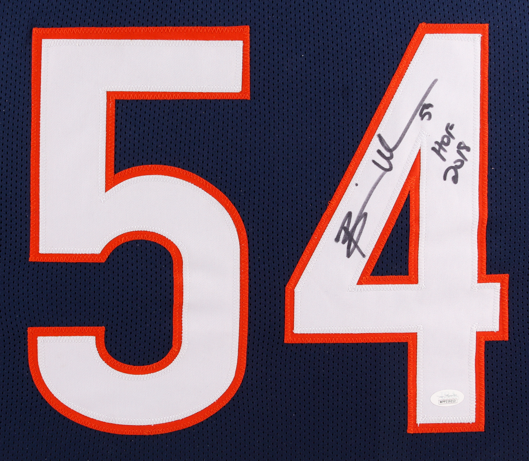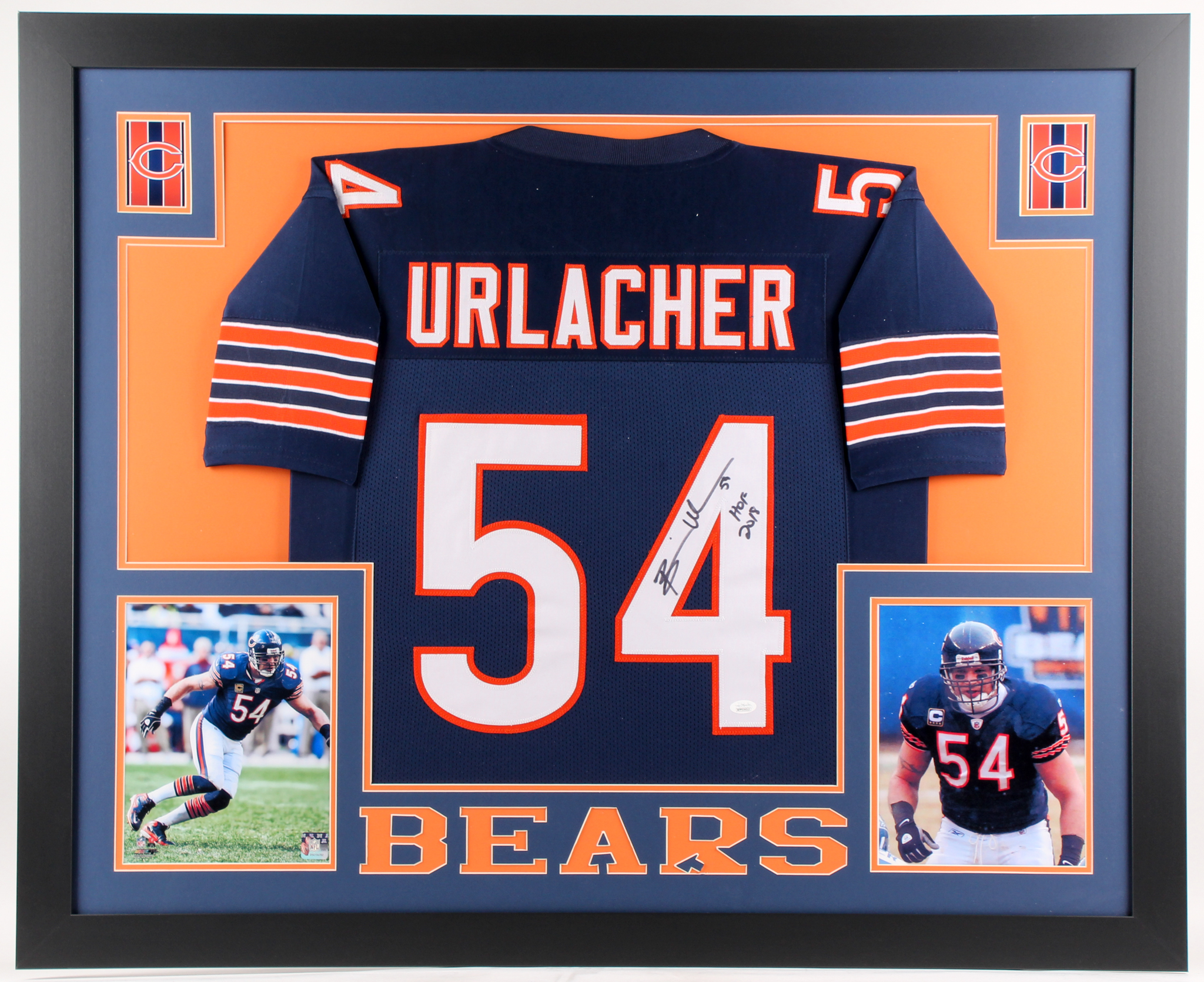 Custom frame measures approximately 35" x 43" in size and features a jersey which has been hand-signed and inscribed in black felt-tip pen by Brian Urlacher (HOF).
