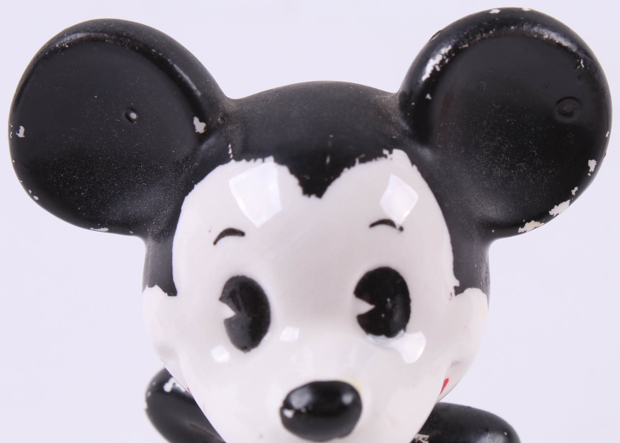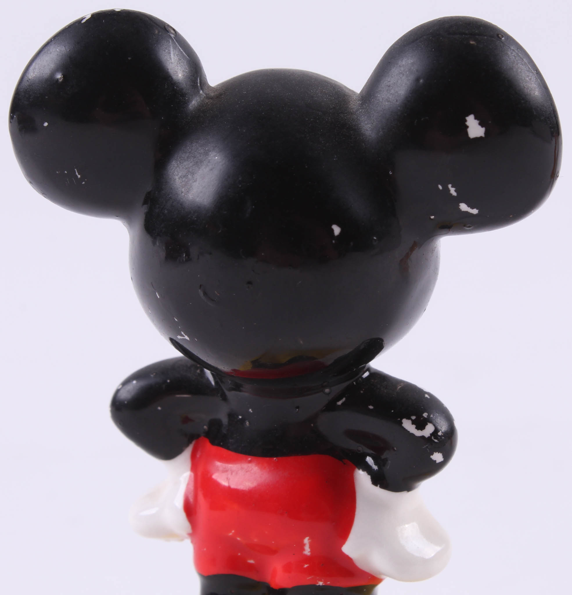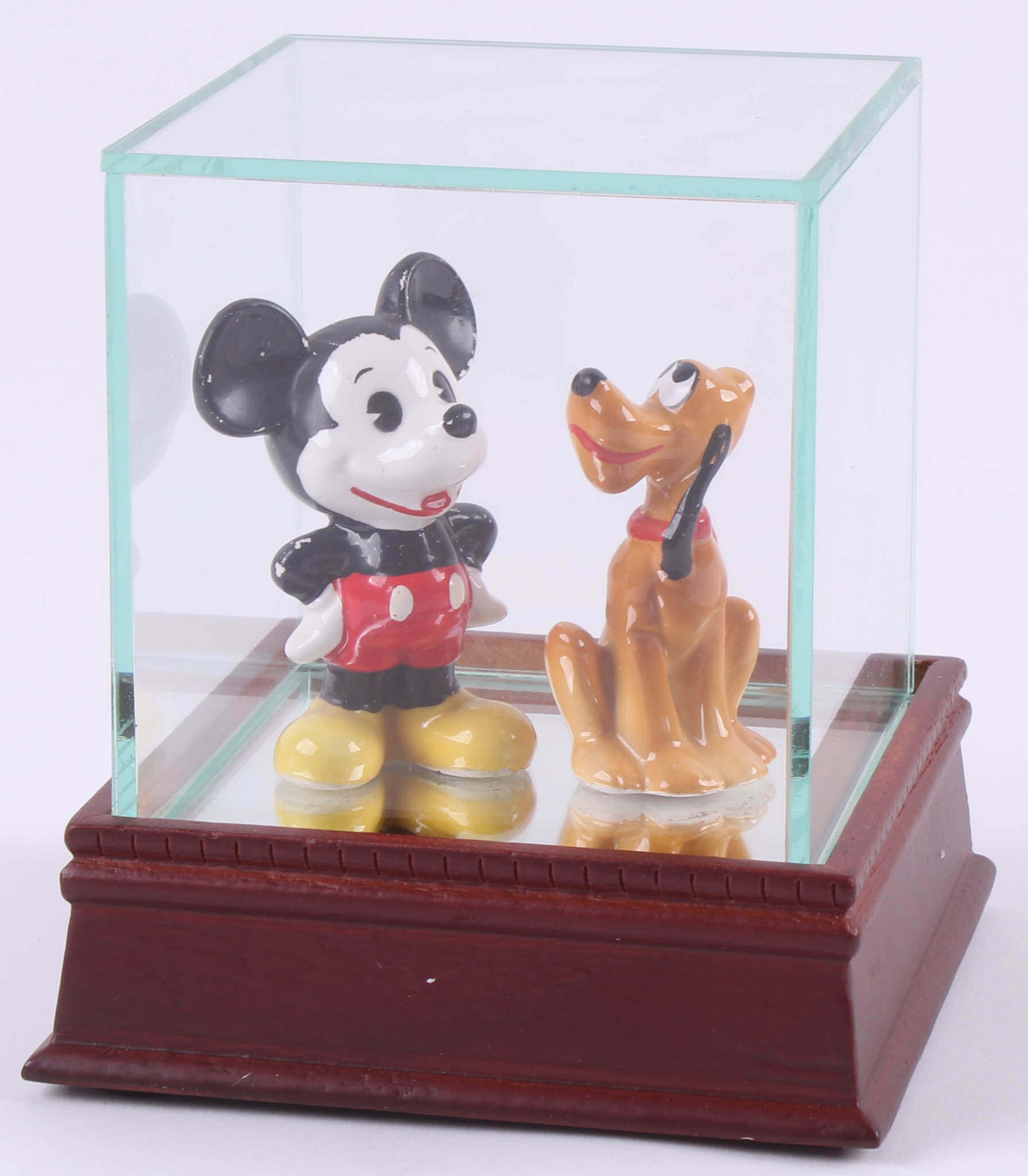 Vintage Disney Mickey Mouse and Pluto ceramic figurines measures approximately 2" in height. Includes high-quality display case with a wooden base and glass cube.
