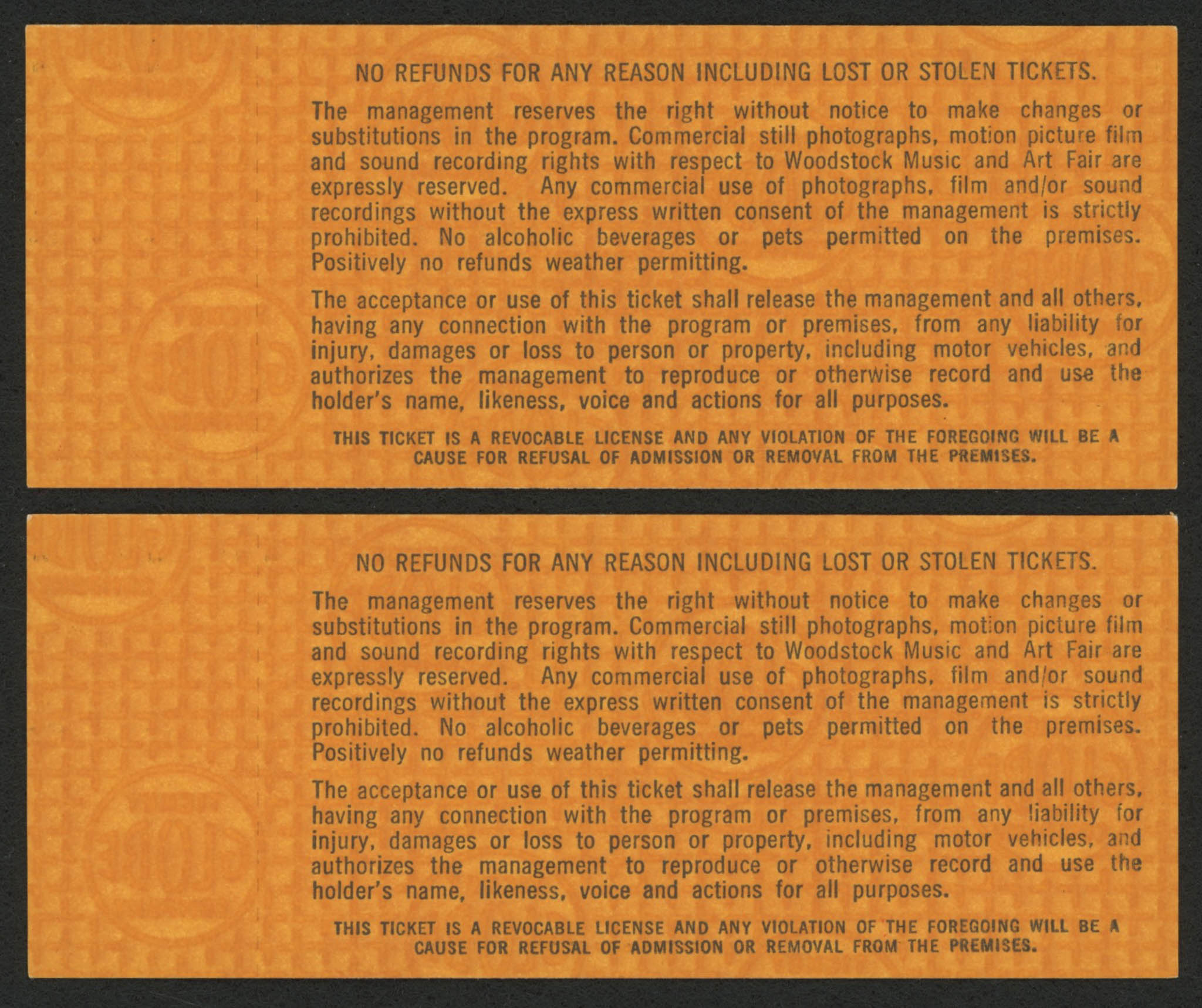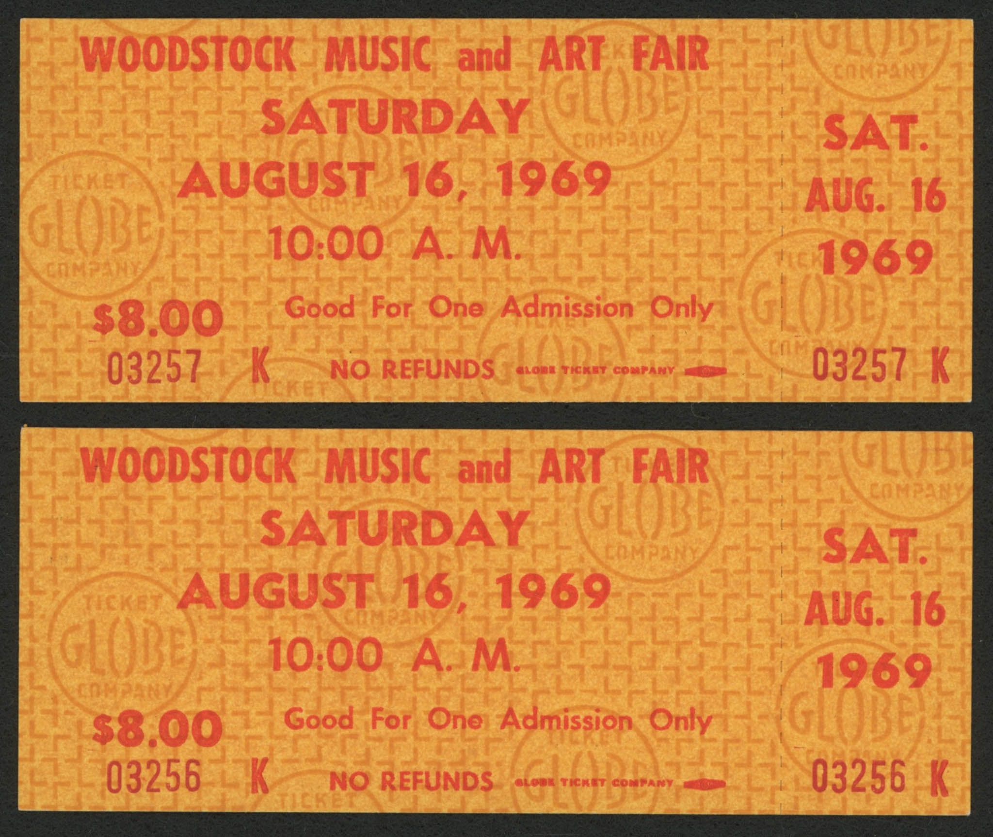 Lot includes all (2) tickets shown. Authentic unused one-day tickets to the Woodstock Music and Art Fair that took place on August 15th, 16th, and 17th in 1969. The tickets have consecutive low-numbered serial numbers. Please see photos for further details regarding the condition of the tickets.
