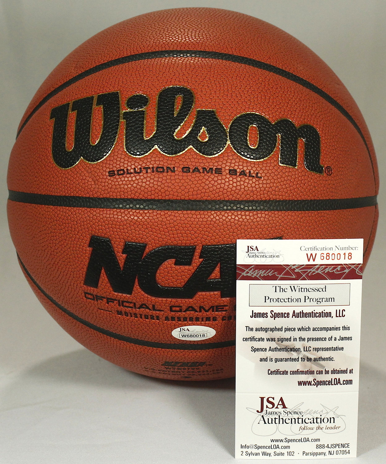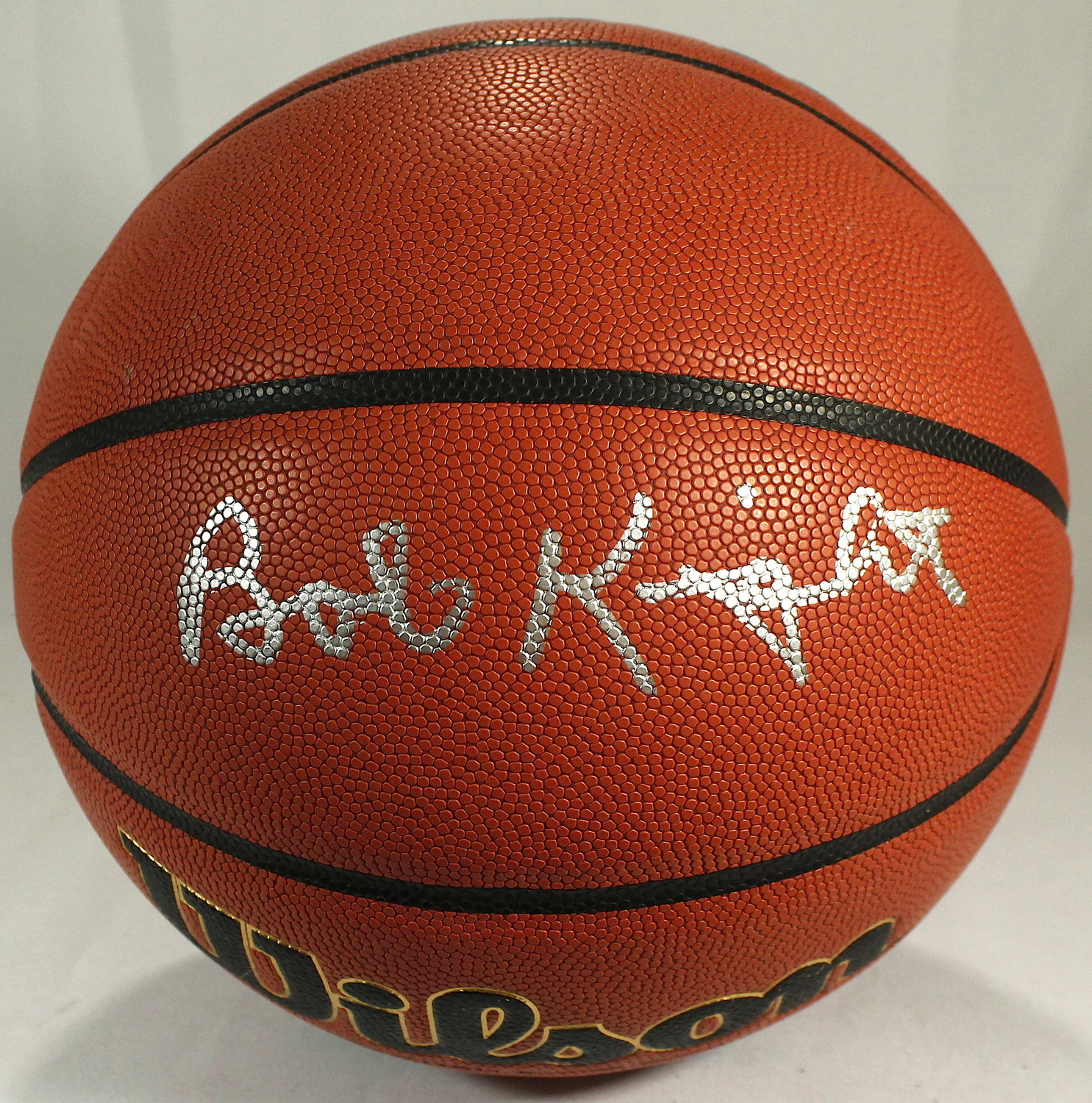 Wilson NCAA Indoor/Outdoor Basketball. Hand-signed in silver paint pen by Bobby Knight (Indiana). The autograph includes an official James Spence Authentication (JSA) hologram and matching COA for authenticity purposes. The signing of this item was witnessed by JSA.