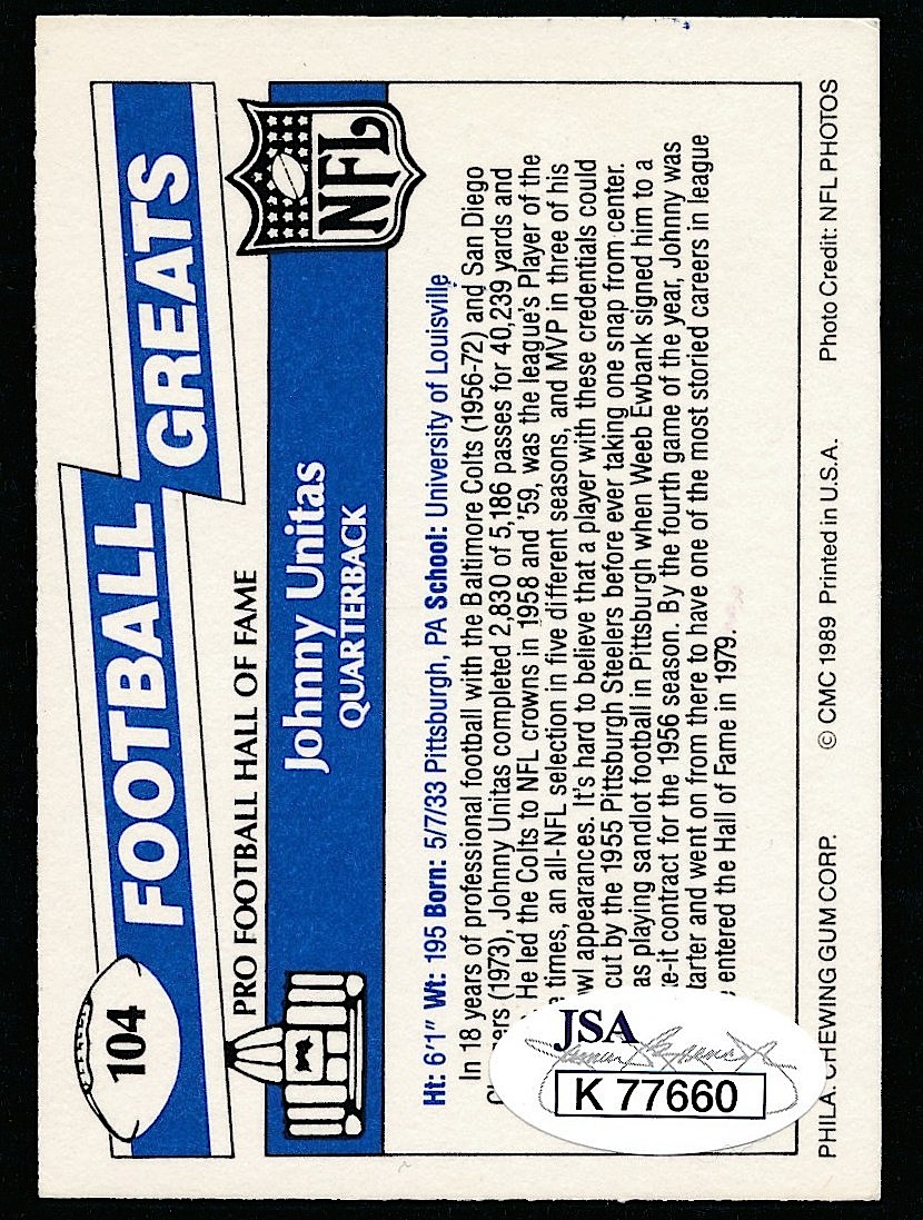 1989 Swell Greats #104 Football Card hand-signed in blue felt tip pen by Johnny Unitas (D 2002, HOF). The autograph includes an official James Spence Authentication (JSA) hologram and matching COA for authenticity purposes.
