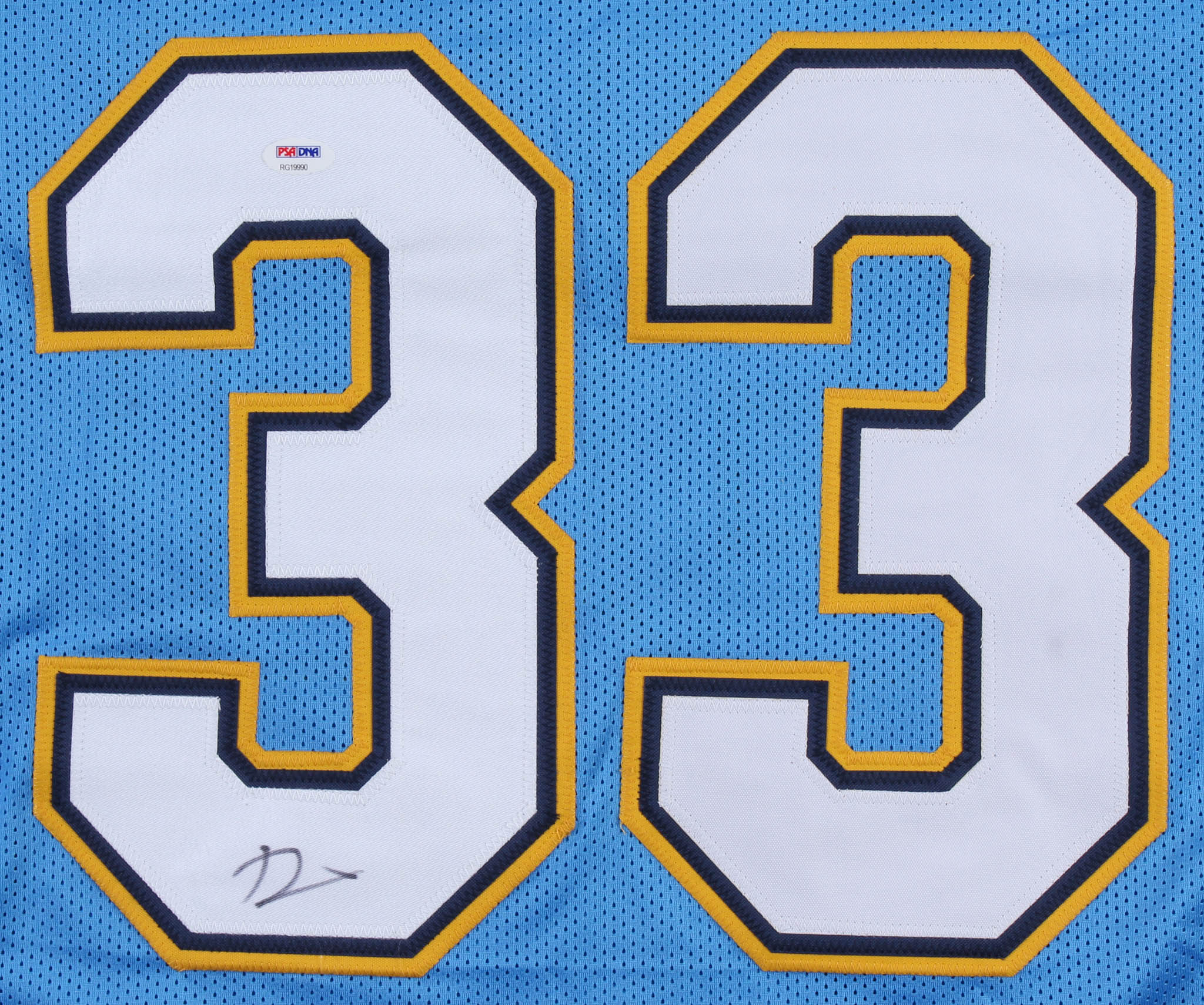 Custom on-field style jersey. Everything is sewn on, size XL. Hand-signed by Derwin James.