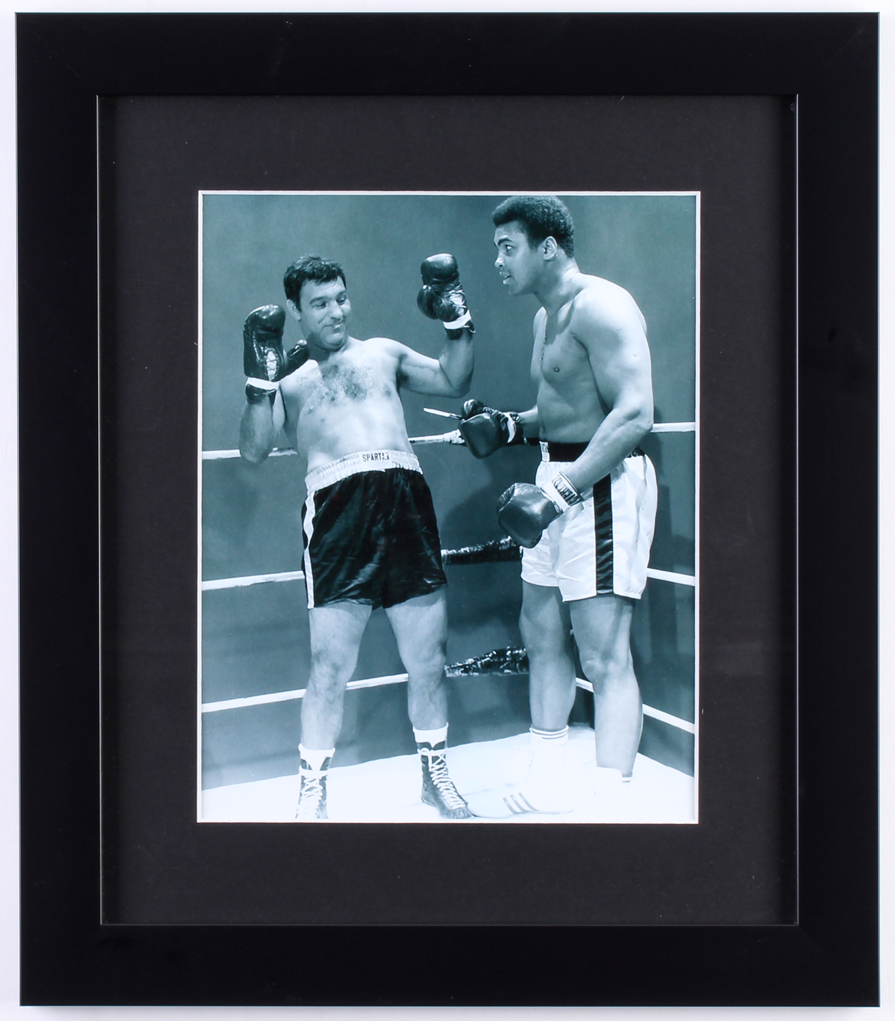 Custom framed display measures 13" x 15" in size and features a photo of Muhammad Ali (D. 2015, HOF) and Rocky Marciano (D. 1969, HOF). Please note, the item is not signed.