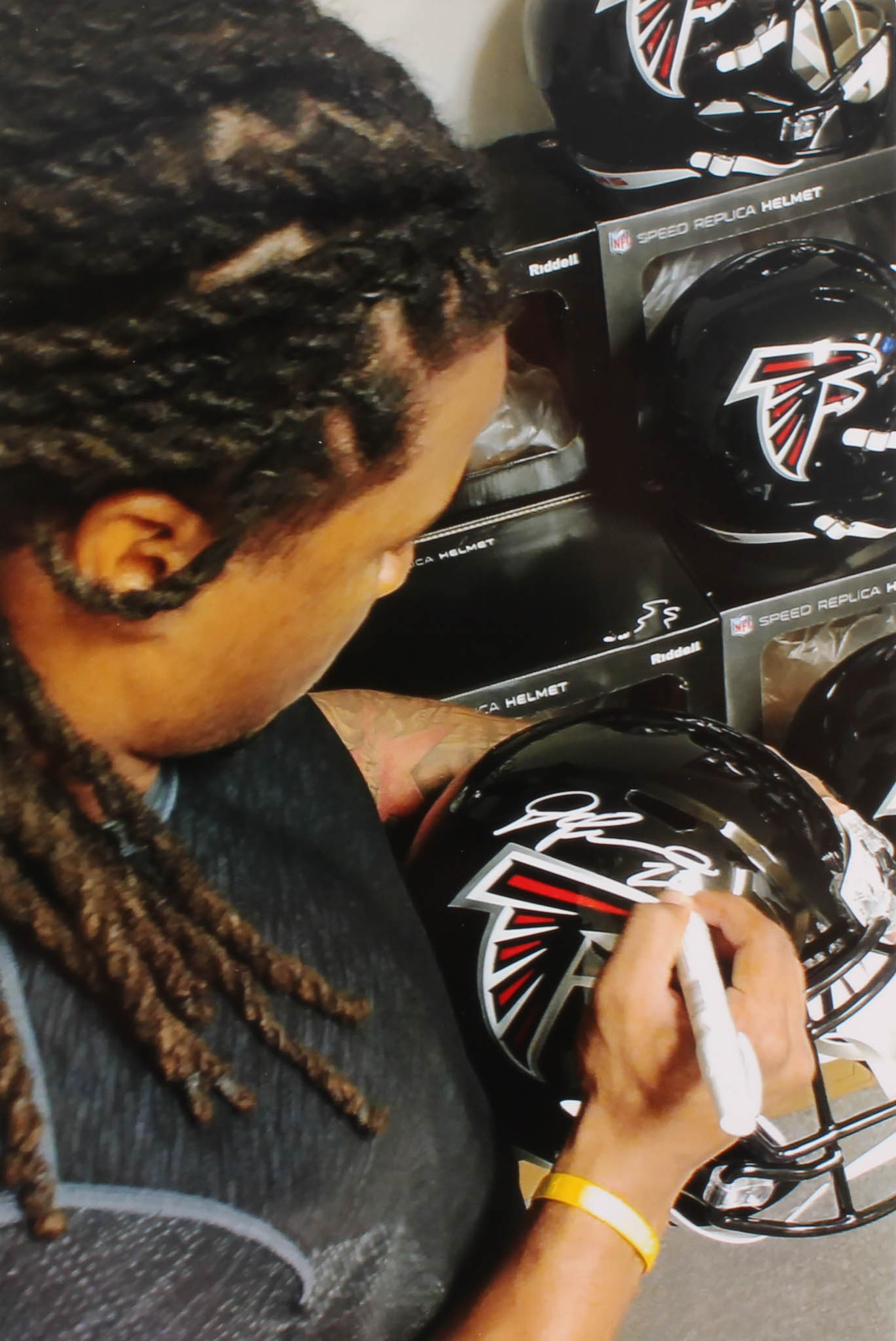 Riddell Atlanta Falcons replica full-size speed helmet. Hand-signed white paint pen by Devonta Freeman.