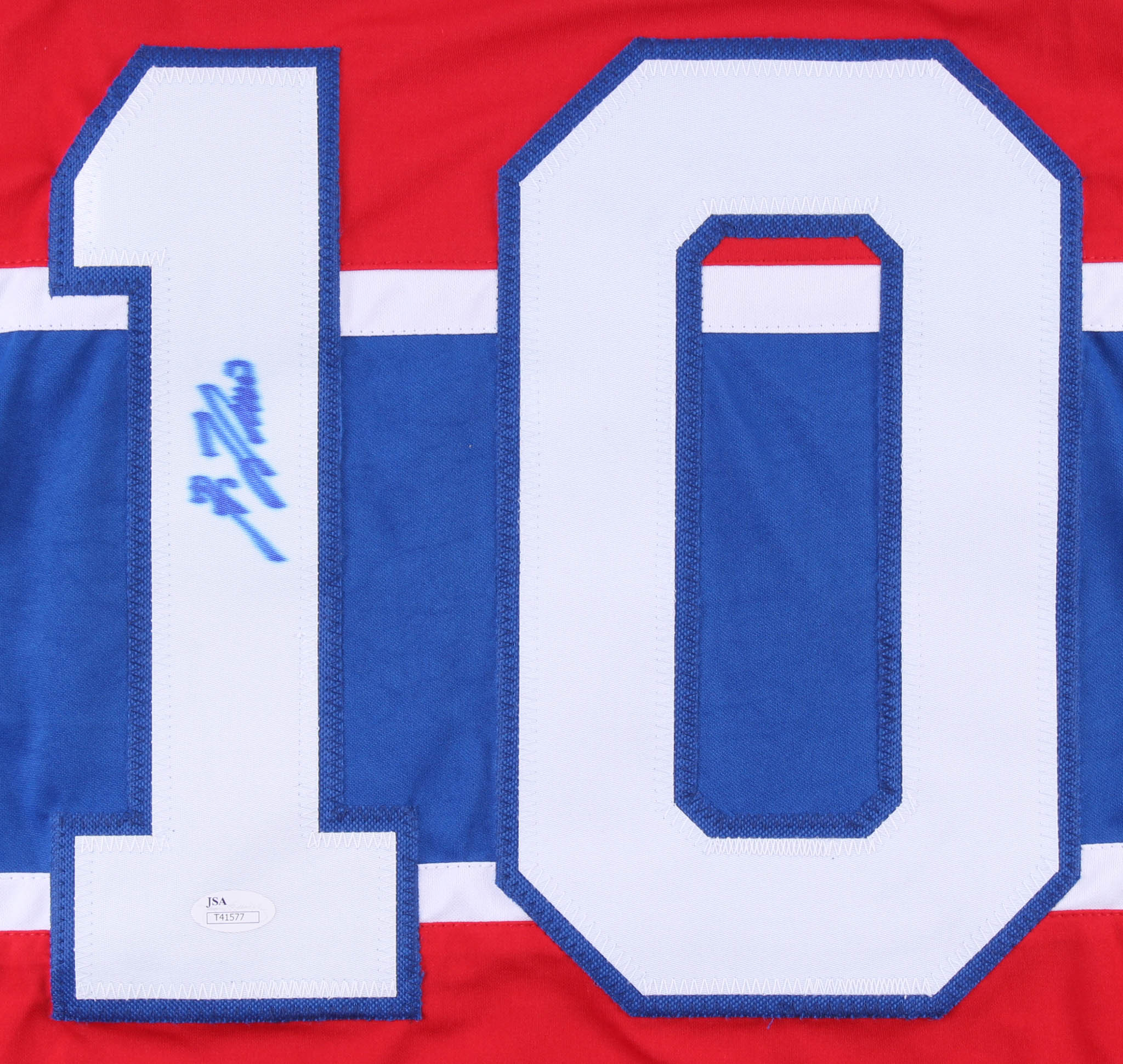 Custom on-ice style jersey. Everything sewn on, size XL. Hand-signed in blue felt-tip pen by Guy Lafleur (HOF).