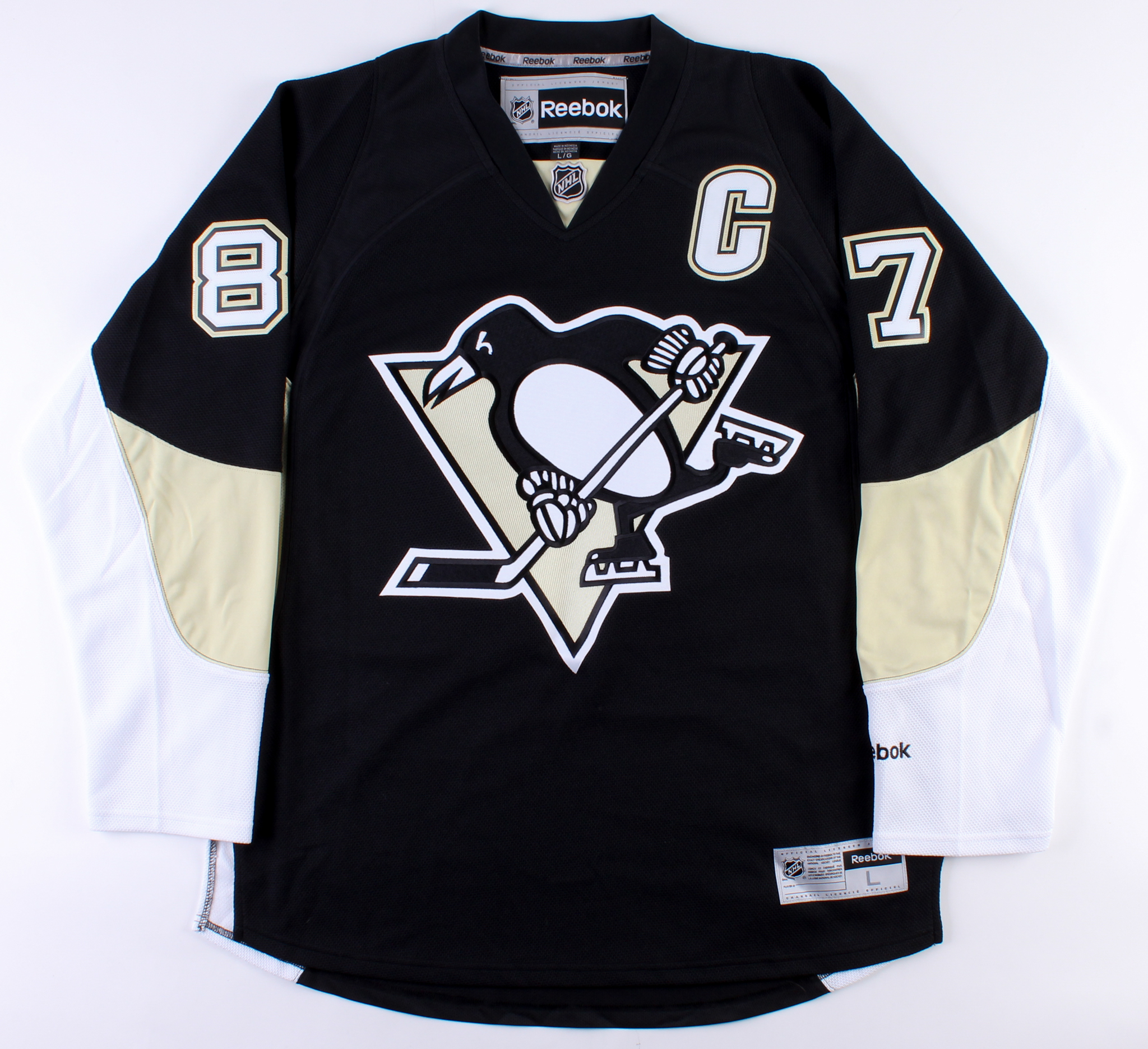 Reebok authentic on-ice style jersey. Everything is sewn on, size L. Hand-signed in black felt-tip pen by Sidney Crosby.
