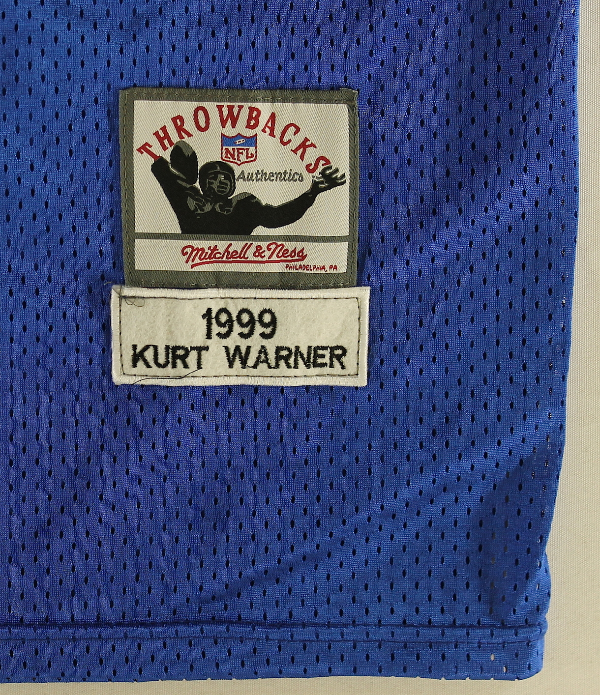 Mitchell & Ness on-field style throwback jersey. Everything sewn on, size 52. Hand-signed in black felt-tip pen by Kurt Warner (Cardinals). The autograph includes an LOA and lifetime authenticity guarantee from Pristine Auction.