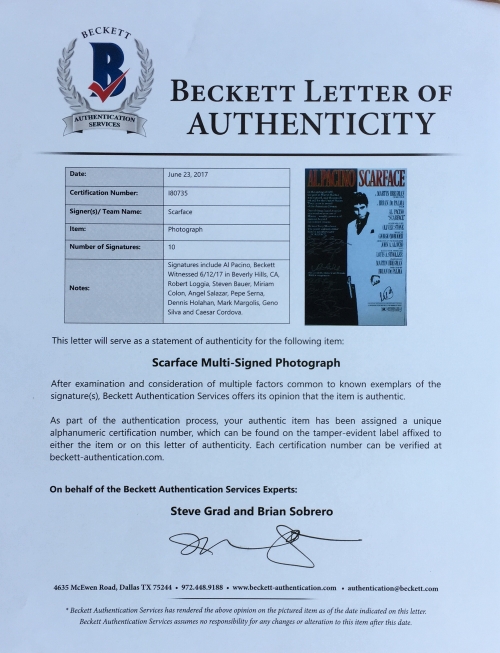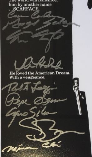 The custom frame measures 18" x 26" in size and features a photo that has been hand-signed in silver paint pen by l Pacino, Robert Loggia, Steven Bauer, Miriam Colon, Angel Salazar, Pepe Serna, Dennis Hollahan, Mark Mangolis, Geno Silva, and Caesar Cordova.