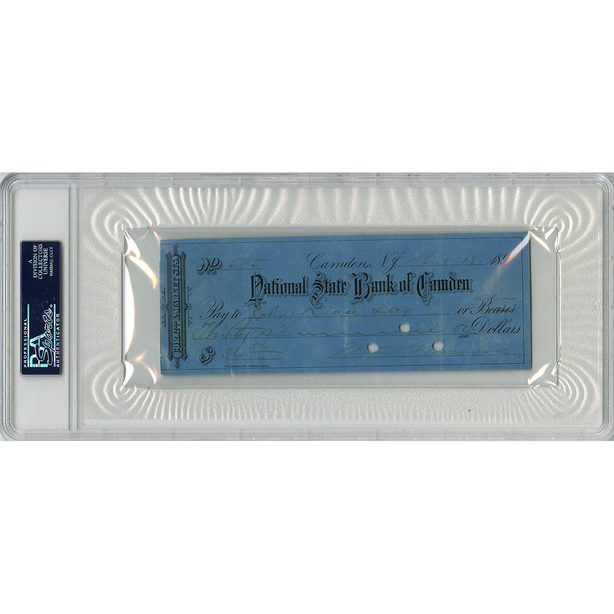 National State Bank of Camden check dated has been hand-signed in pencil by John Montgomery Ward (D. 1925, Giants HOF).