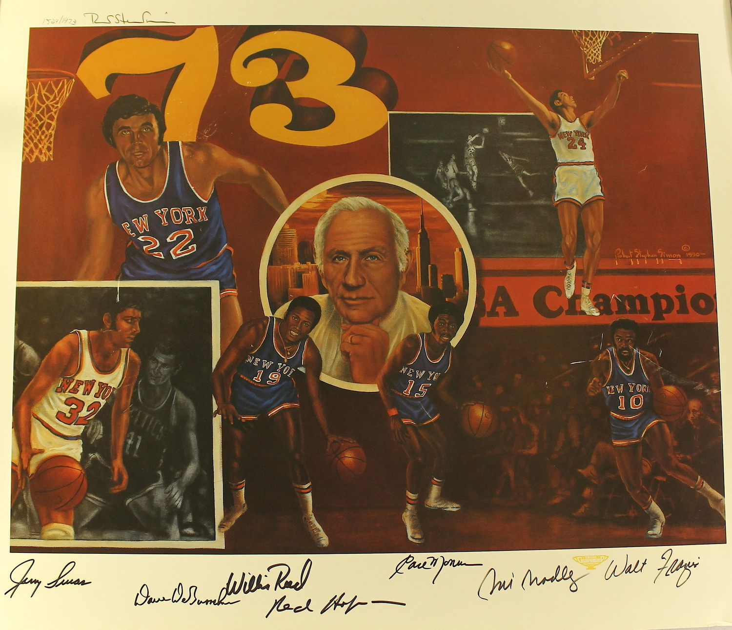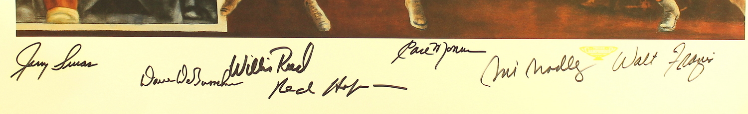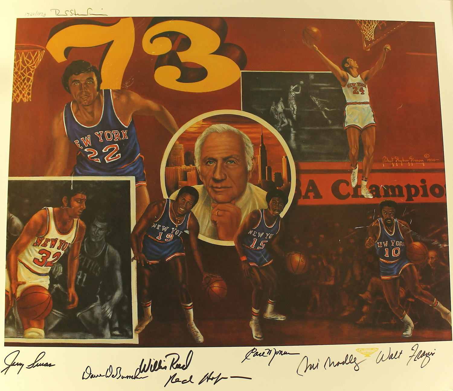 1973 Knicks NBA Champions 29" x 24" lithograph hand-signed by (7) with Dave DeBusschere, Willis Reed, Earl Monroe, Walt Frazier, Bill Bradley, Red Holzman and Jerry Lucas. The lithograph is also hand-signed by the artist and numbered #1529/1973. Please note, the lithograph has some moderate surface wear and scratching (please see the photos for details).