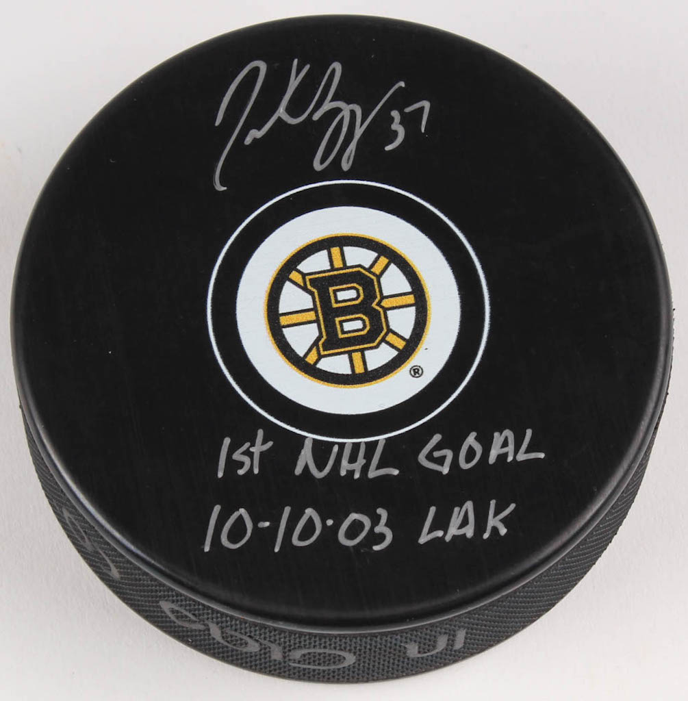 Patrice Bergeron Signed Boston Bruins Logo Hockey Puck Inscribed "1st NHL Goal 10-10-03" & "LAK" (Bergeron Hologram)