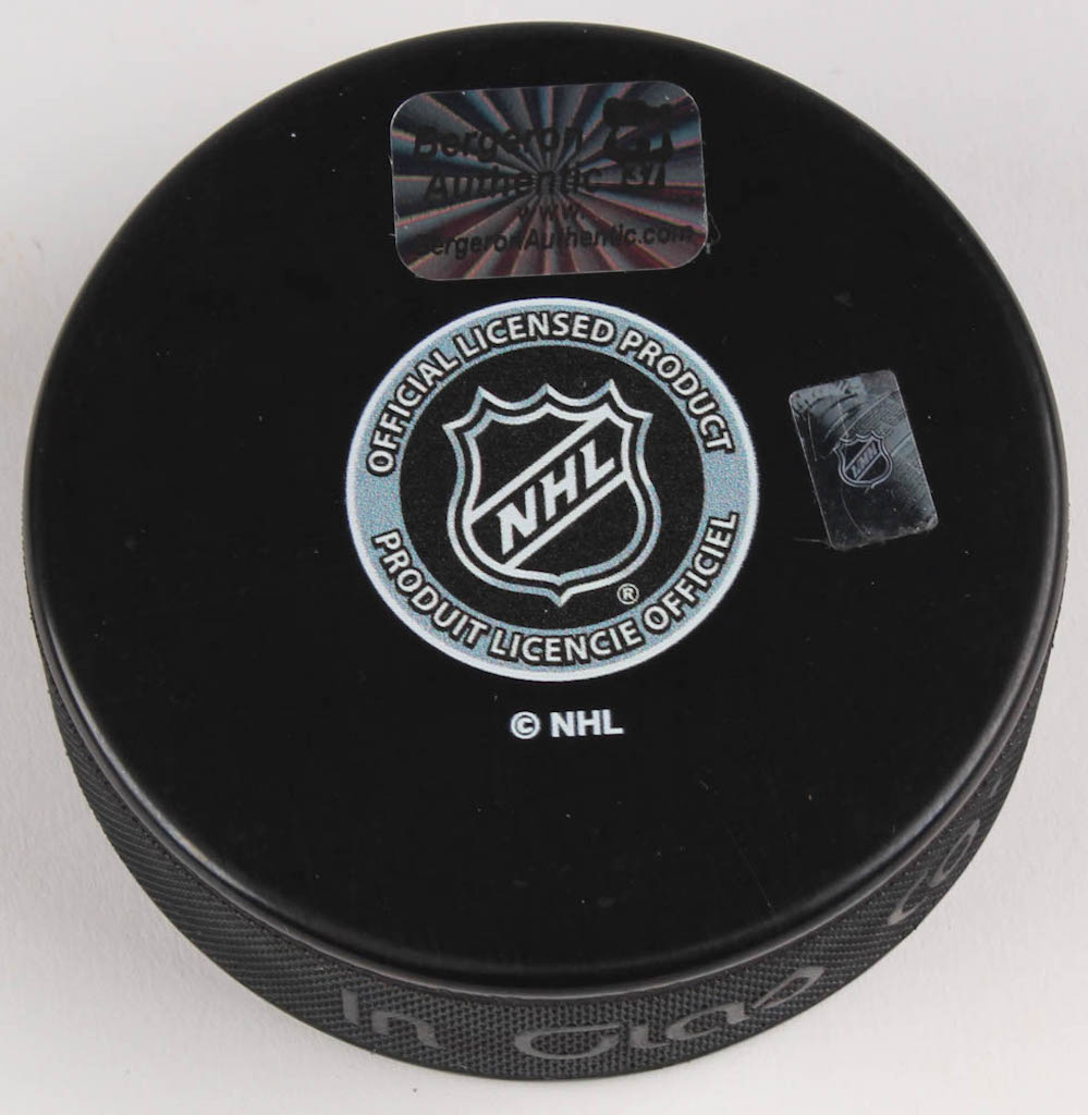 Official NHL Boston Bruins Logo Hockey Puck. Hand-signed in silver paint pen by Patrice Bergeron.