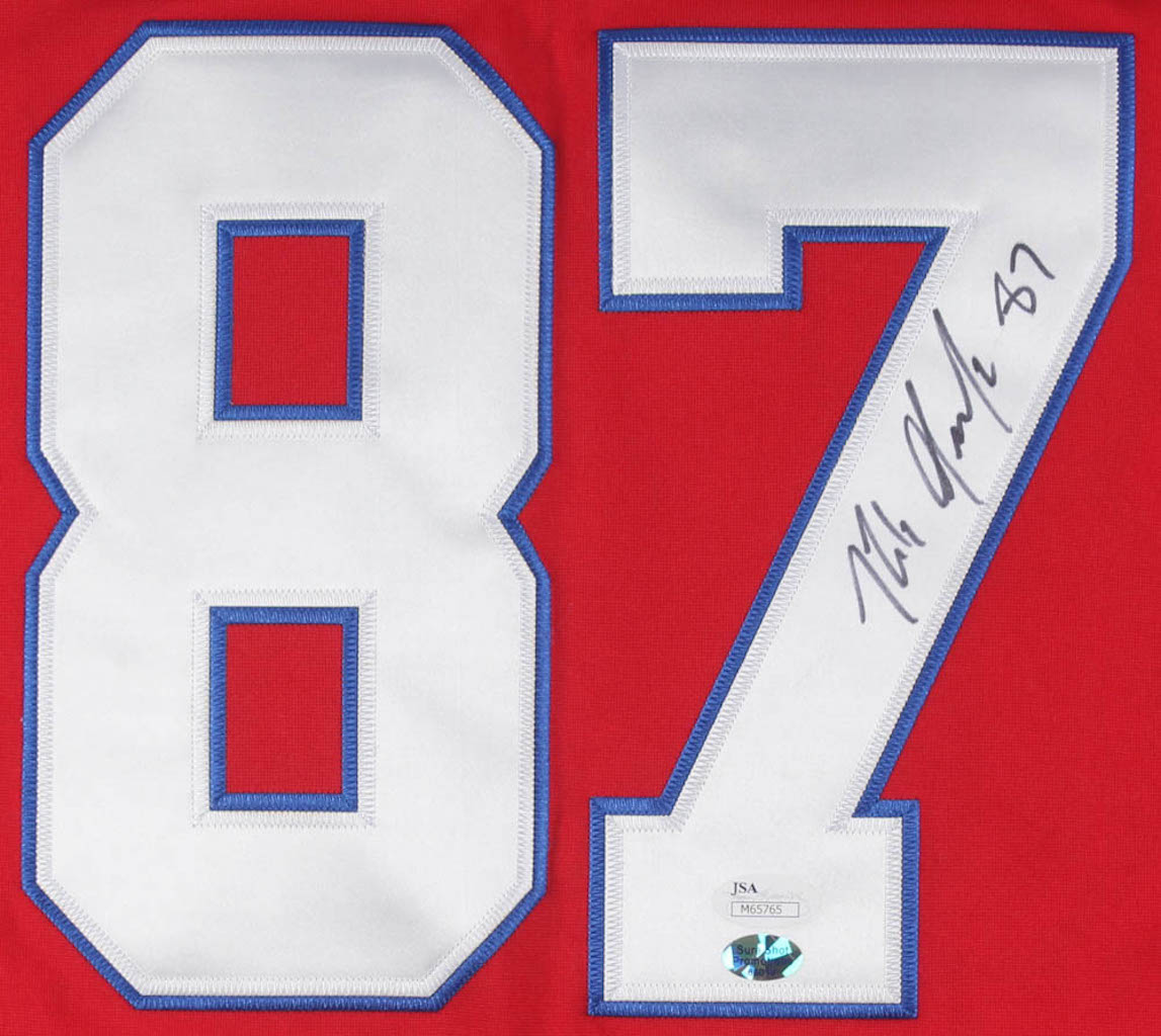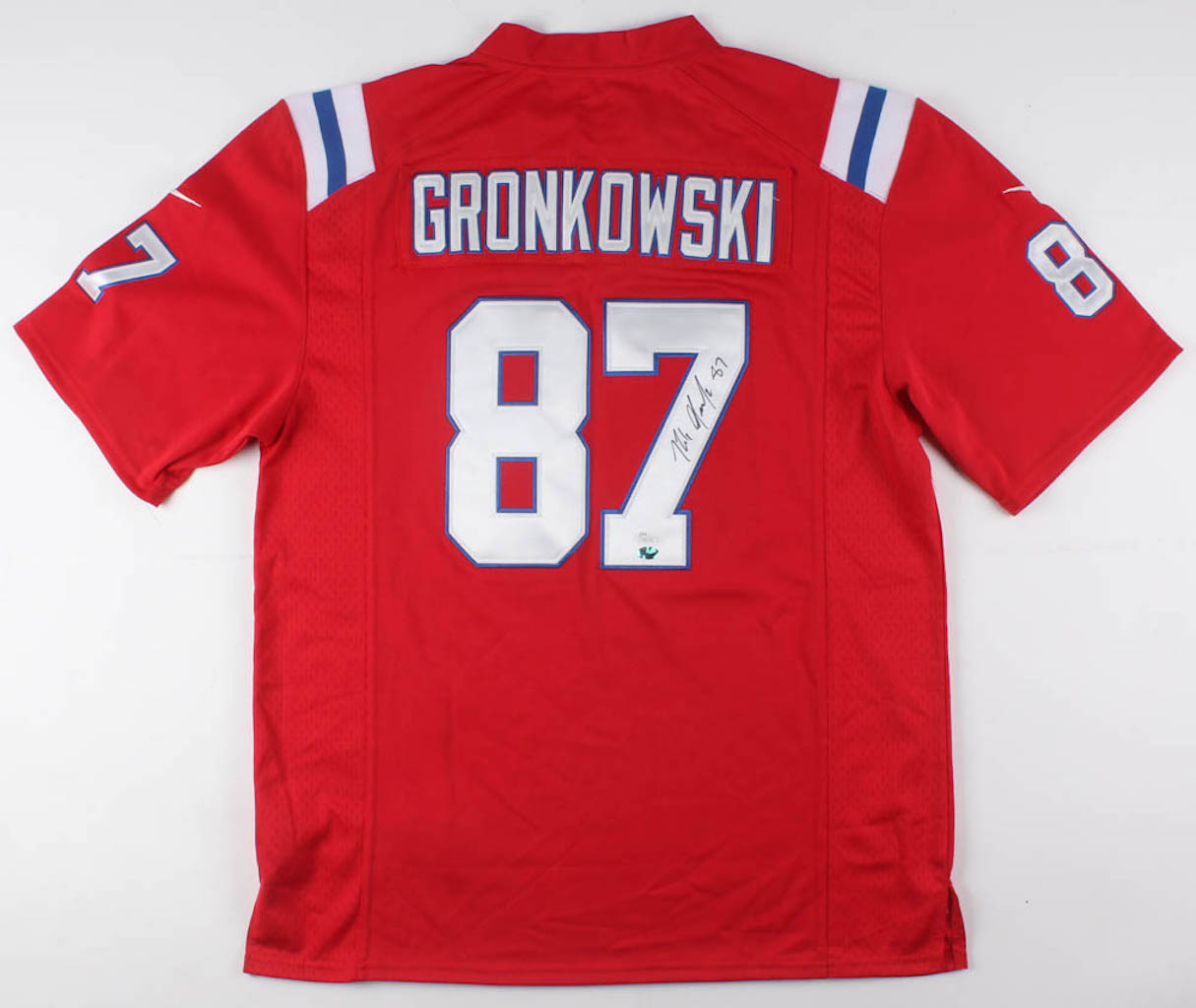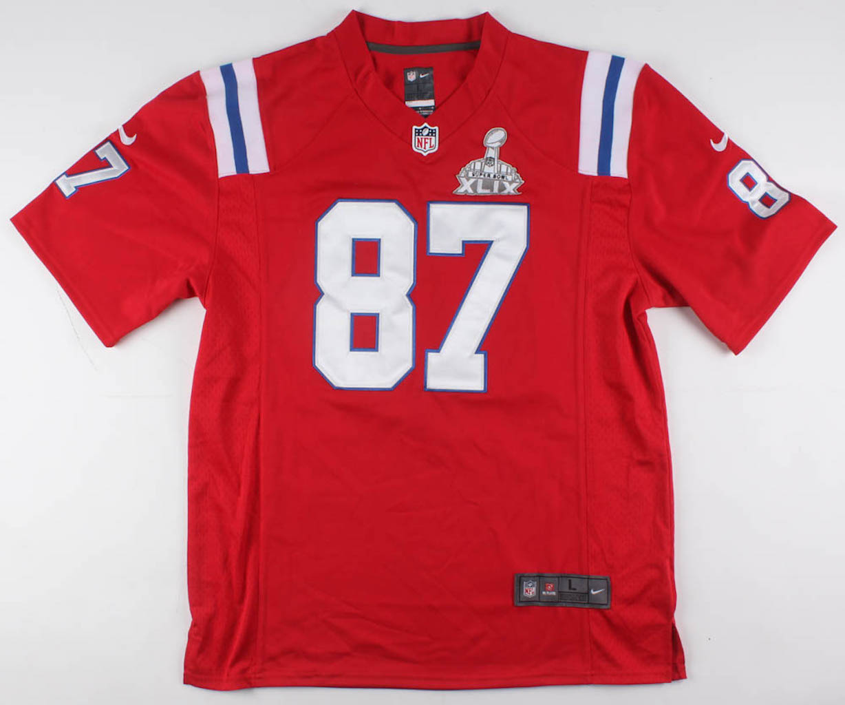 Nike Elite on-field style throwback jersey. Everything is sewn on, size L. Hand-signed in black felt-tip pen by Rob Gronkowski.
