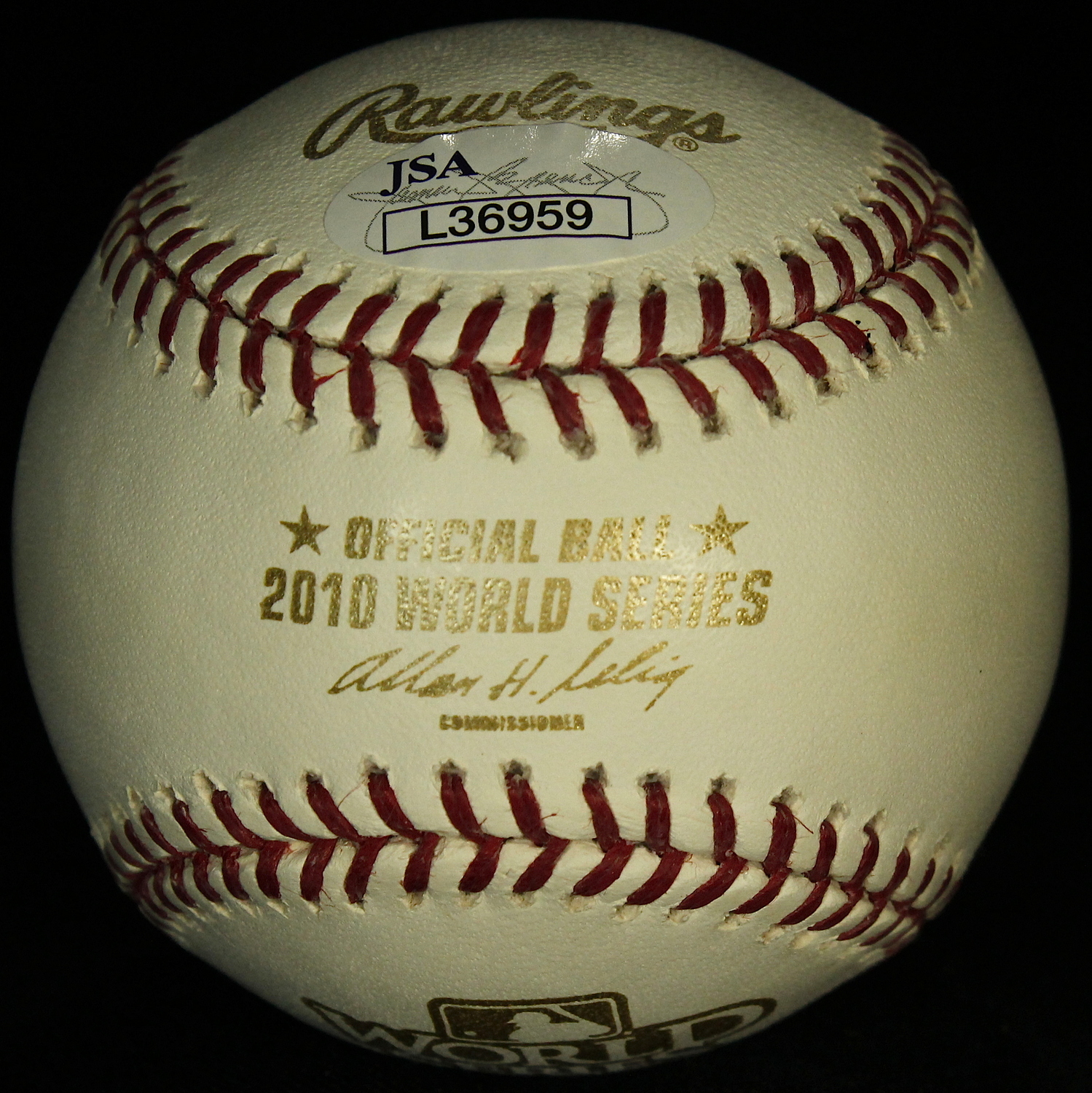 Rawlings Official 2010 World Series baseball. Hand-signed and inscribed in blue ink by Andres Torres (Giants). The autograph includes an official James Spence Authentication (JSA) hologram and matching COA for authenticity purposes.