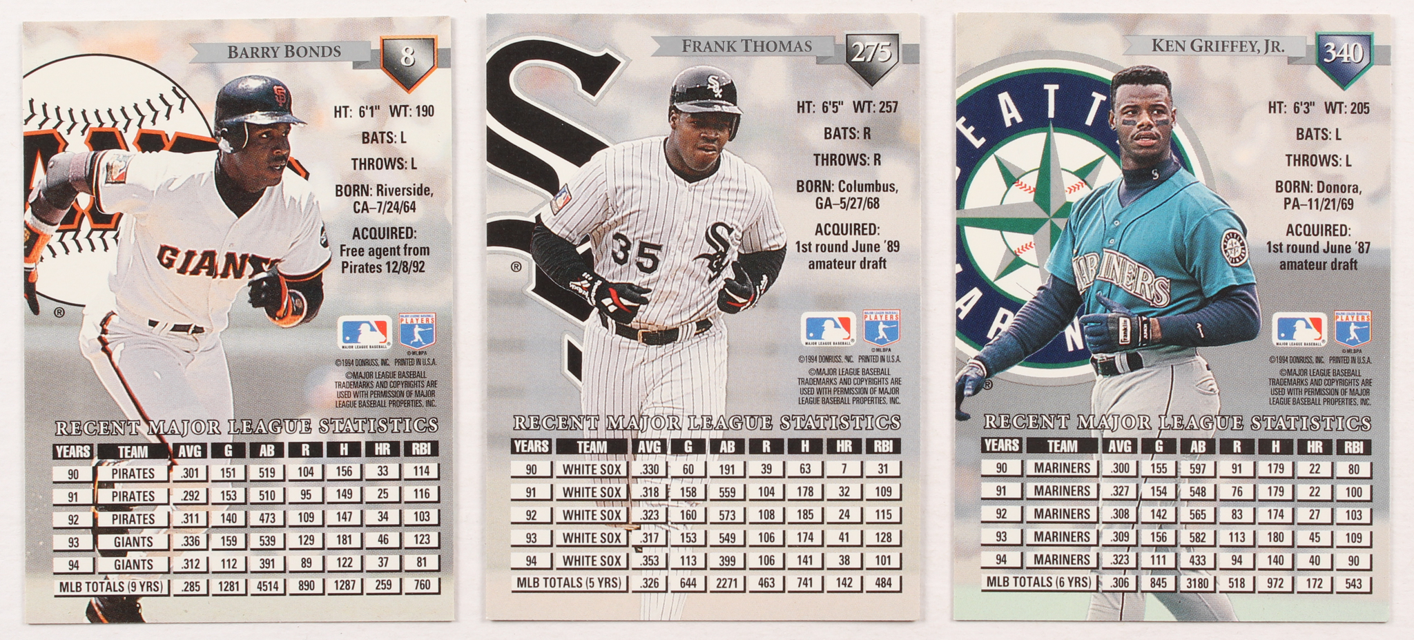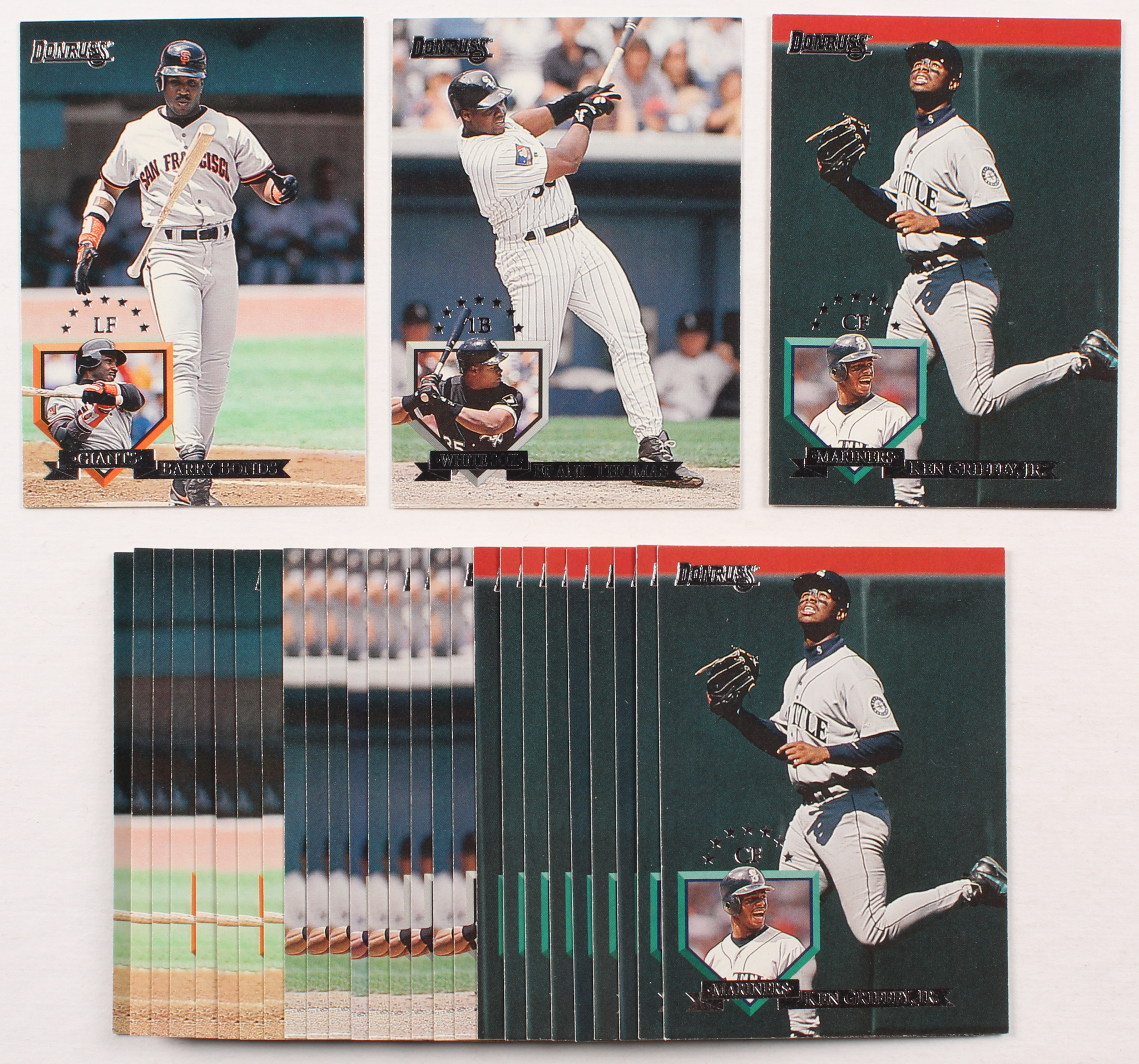 Lot of (29) 1995 Donruss Baseball Cards with (9) #8 Barry Bonds, (10) #275 Frank Thomas, (10) #340 Ken Griffey Jr.