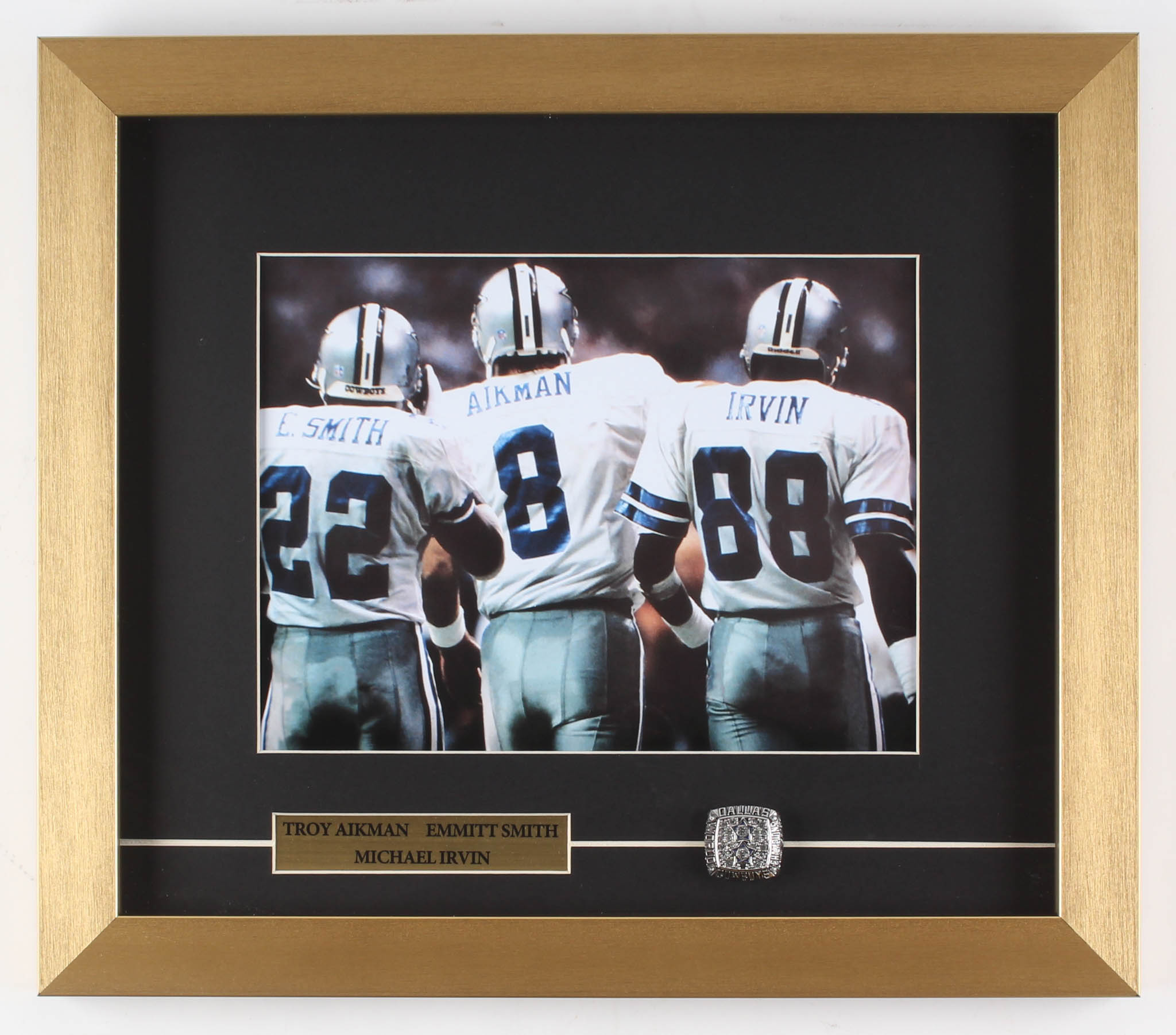 Custom framed display measures 14" x 16" in size and features a photo of Troy Aikman (HOF, Emmitt Smith (HOF) and Michael Irvin (HOF). Display also includes a replica Super Bowl ring. Please note, the item is not signed.