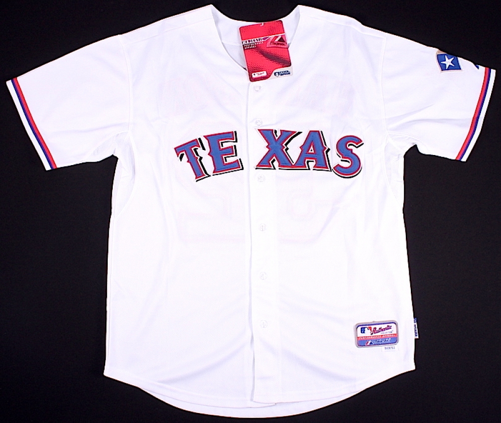 Majestic Authentic Cool Base on-field style jersey. Everything sewn on, size 52. Hand-signed in silver paint pen by Josh Hamilton.