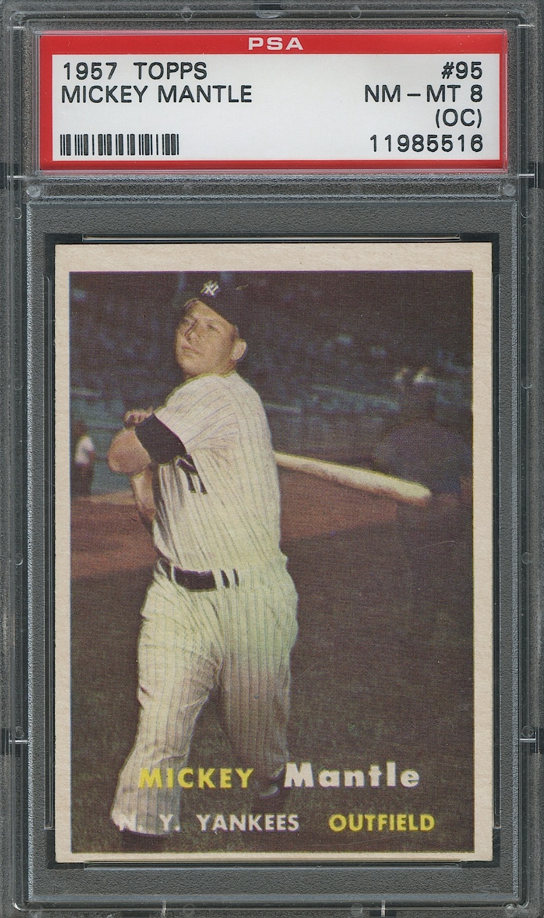1957 Topps #95 Mickey Mantle (Yankees). Graded PSA 8 (NM-MT) OC. Please see scans for more detail on the condition of the card.
