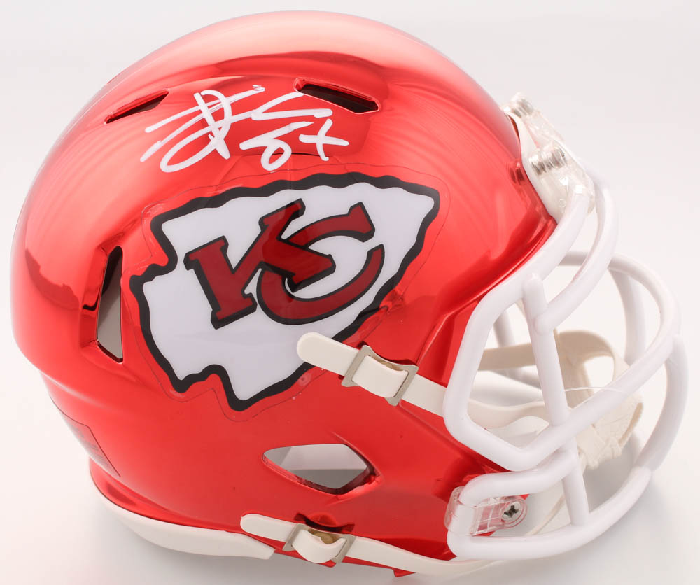 Kansas City Chiefs Chrome Speed mini helmet has been hand signed in white paint pen by Travis Kelce.