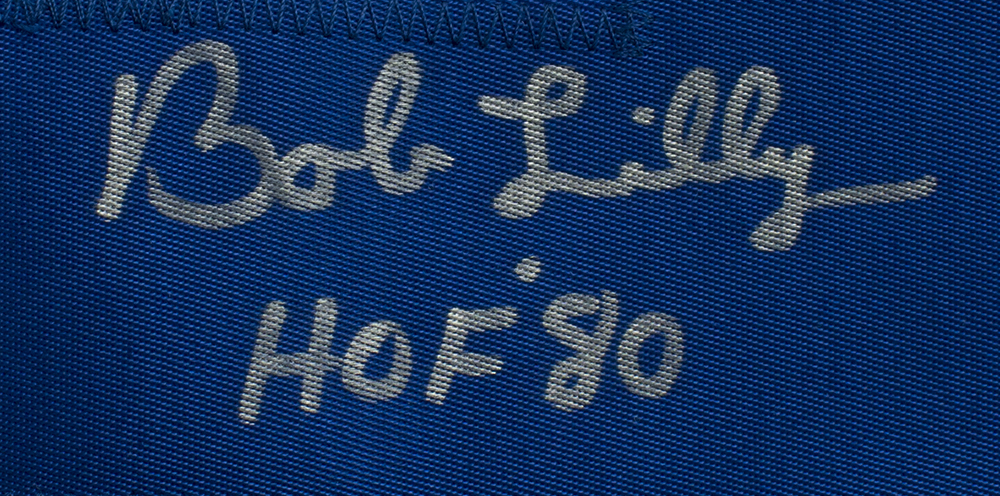 Custom on-field style jersey. Everything is sewn on, size XL. Hand-signed and inscribed in silver paint pen by Bob Lilly (HOF).