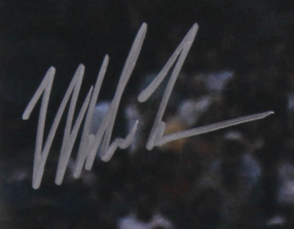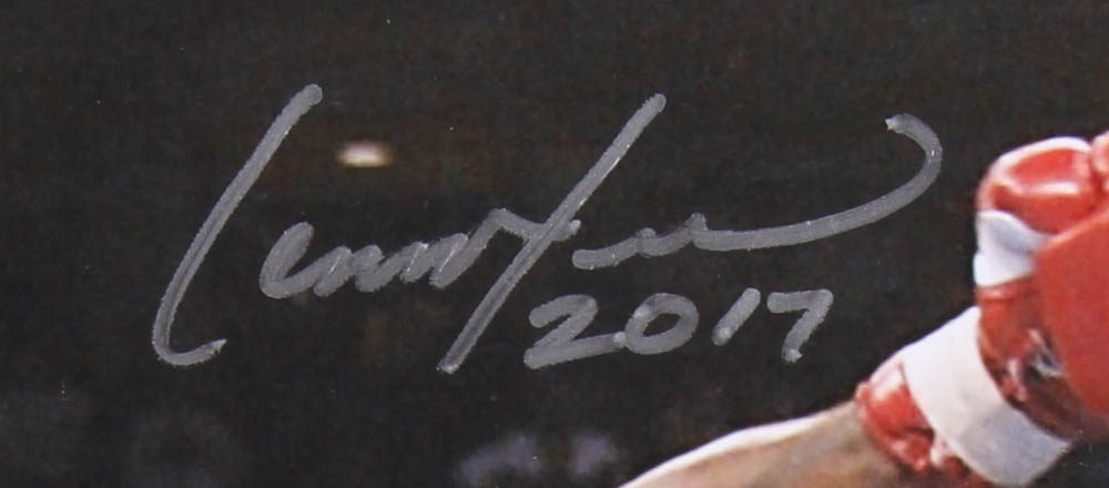 Photo measures 16" x 20" in size and has been hand-signed and inscribed in silver paint pen by Mike Tyson (HOF) and Lennox Lewis (HOF).