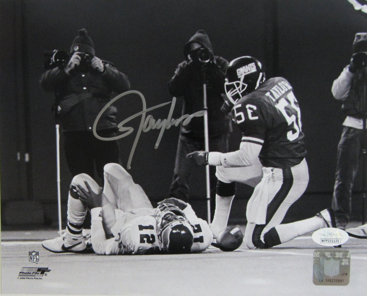 Photo measures 8" x 10" in size and has been hand-signed in silver paint pen by Lawrence Taylor (HOF).