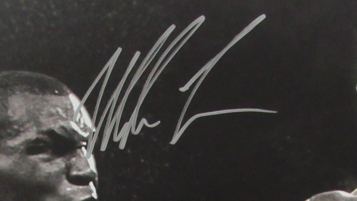 Photo measures 16" x 20" in size and features a photo that has been hand-signed in silver paint pen by Mike Tyson (HOF).