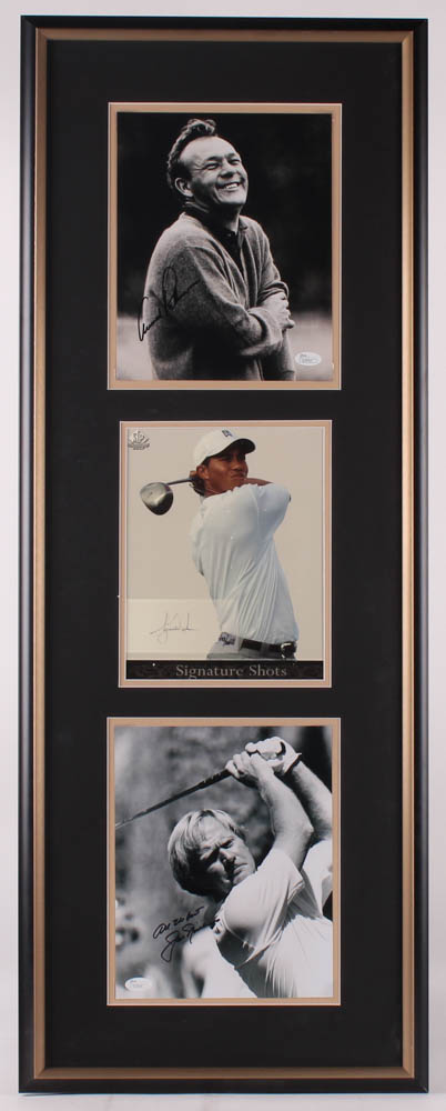 Custom framed photo display measures 15" x 40" in size and has been hand-signed in black felt-tip pen by (3) including Arnold Palmer, Jack Nicklaus, and Tiger Woods. Frame is Limited Edition #43 / 100.